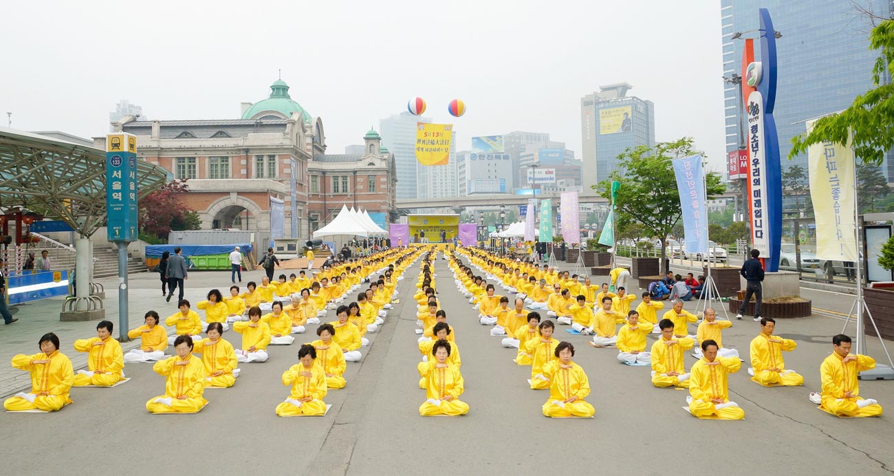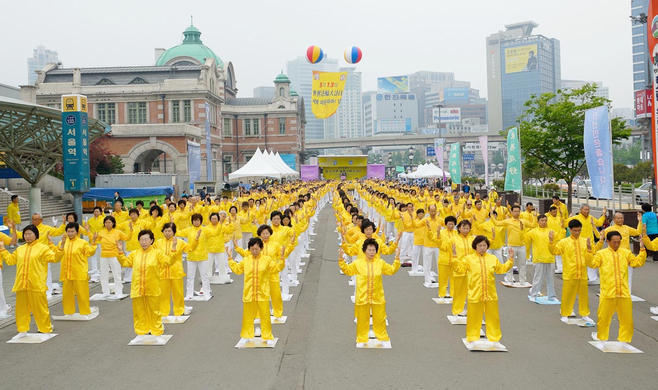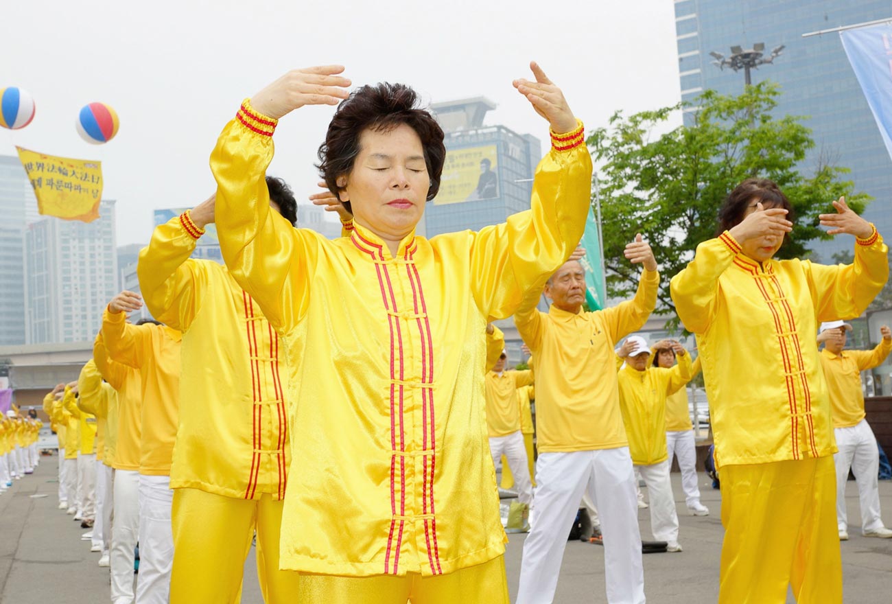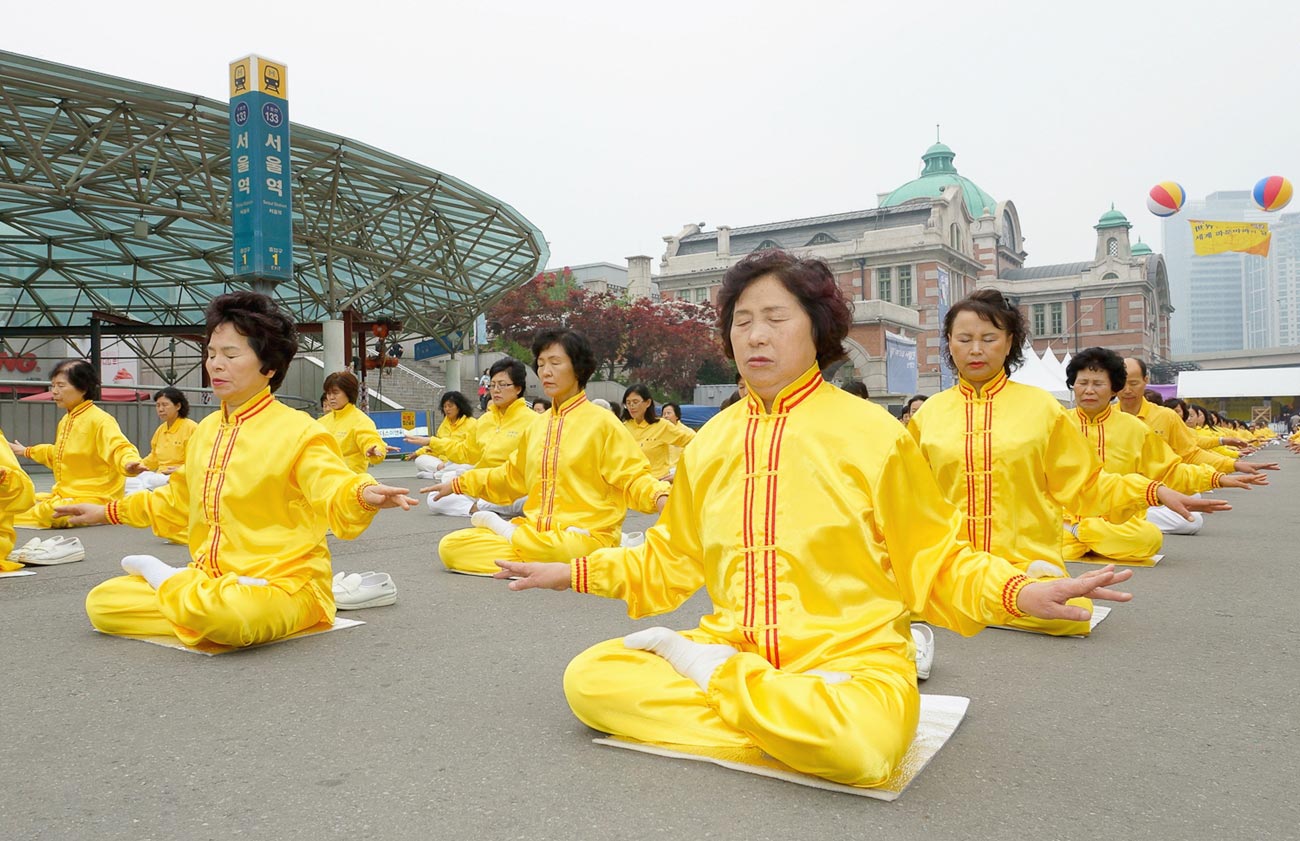上午,在正式活动举行之前,学员们集体炼功,并介绍法轮功在祛病健身方面具有的奇特功效。五月和煦的阳光下,舒缓柔和的五套功法展示,美好壮观,连首尔站匆忙疾行的路人也被这景象吸引,忍不住驻足观看。