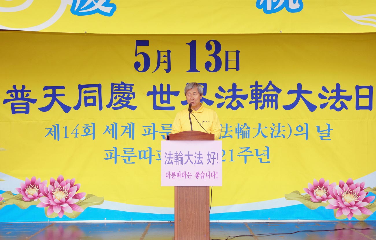 韩国法轮大法学会会长权洪大在集会发言中表示“法轮功学员修炼‘真善忍’,并为成为更好的人而努力,遇到问题时,向内找原因提高心性,走的是真正修炼者的路。”他表示,“实践法轮大法的教诲‘真、善、忍’,是未来的保障,也是全球人民的希望。我们为了实现、广传这种崇高的精神,聚集在这里。”