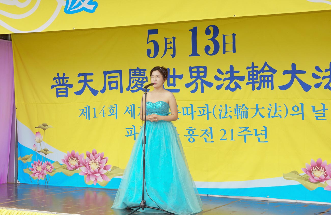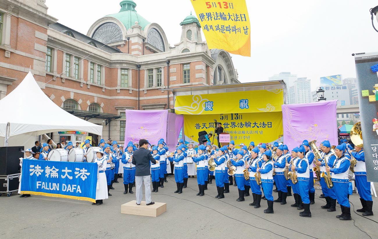 在韩国交通的心脏——首尔站进行节日祝歌献唱和乐器演奏、功法示范、天国乐团合奏、法轮功真相图片展等,吸引大批市民们驻足观看。整个庆祝活动气氛隆重祥和。
