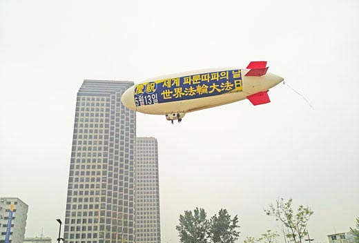 ![]() 活动现场首尔站上空飘扬着“庆祝法轮大法洪传21周年”的大型气球 |