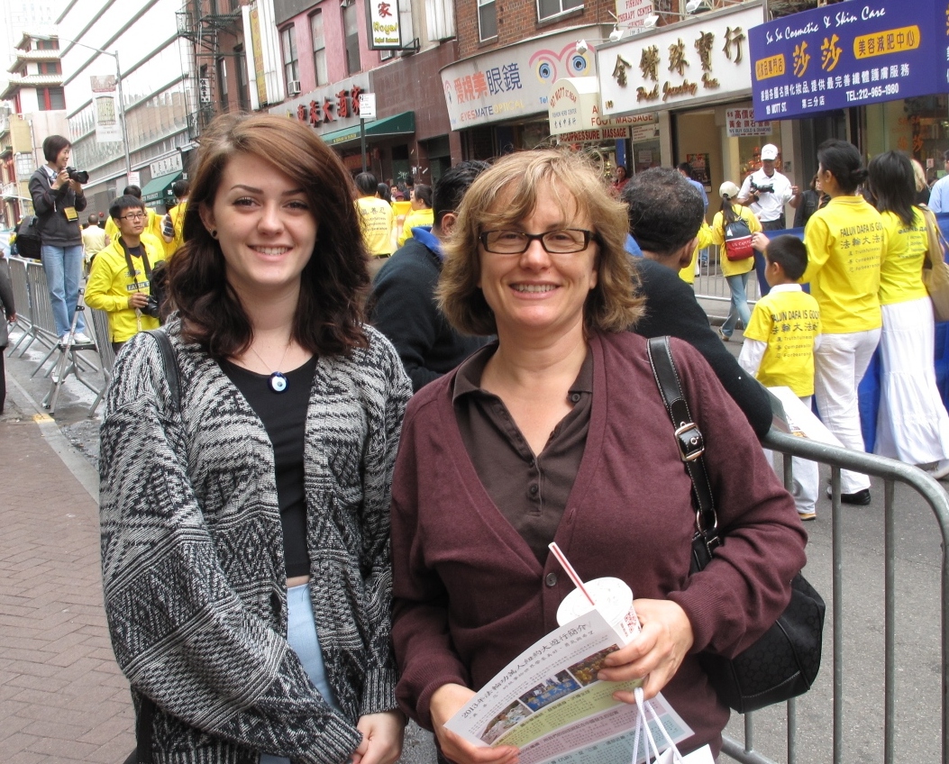 住在纽约的卡罗尔女士和女儿凯瑟琳一起到唐人街来玩,一见到法轮功游行队伍,卡罗尔女士拉着女儿停下脚步认真观看。她赞叹说:“太好了,传递的就是平和、爱和人性的尊严。”