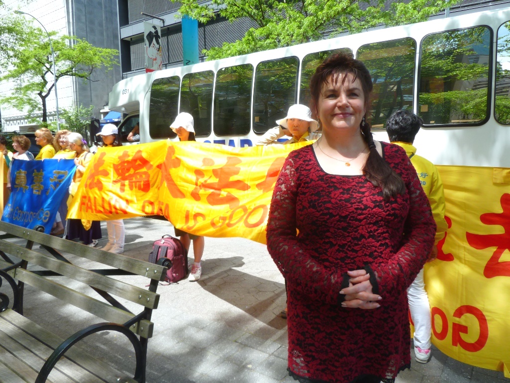 爱尔兰学员翠西•奥杜尔明努格(Tracey O'Dwyer-Minogue)从二零零五年开始修炼法轮功。看似偶然的一次机会,她在城市图书馆看到一份介绍法轮功的传单。因为她从很小的时候就练过瑜伽和打坐,随着年龄的增长,她仍然在寻找,花了很多的时间和金钱。翠西觉得法轮功很好,和其它的都不同,只需要一本书一个打坐的垫子就可以开始修炼了,不需要再到处去跑。修炼大法为翠西带来很多,她感到自己的身心得以净化,生命有了意义,从二零零六年以后,她年年都来参加纽约法会,这已经是第八次了。