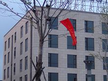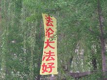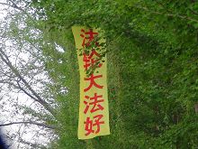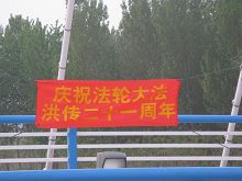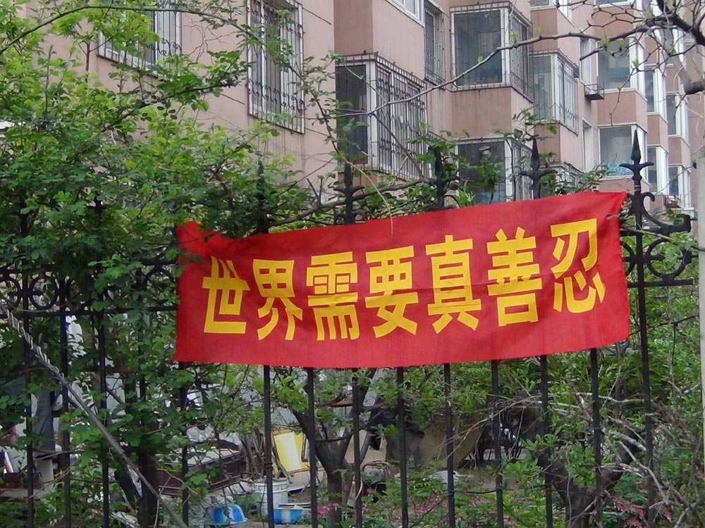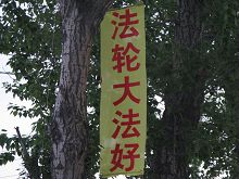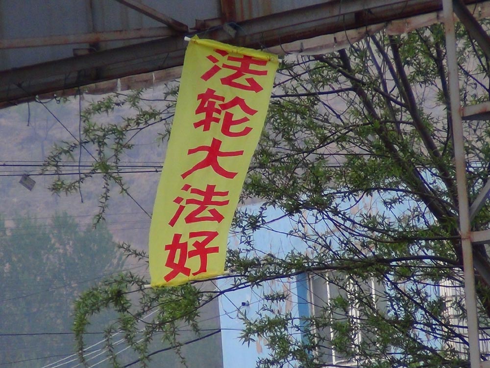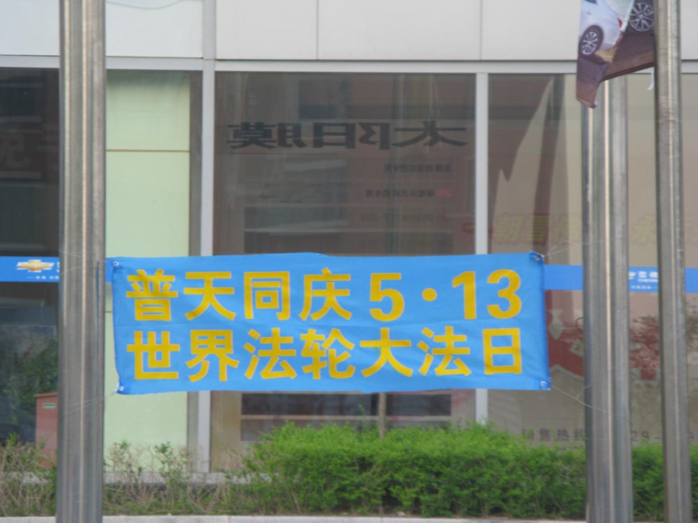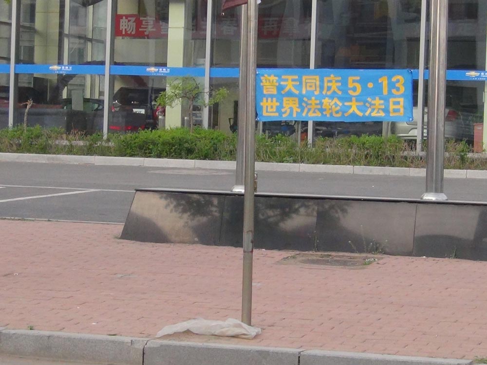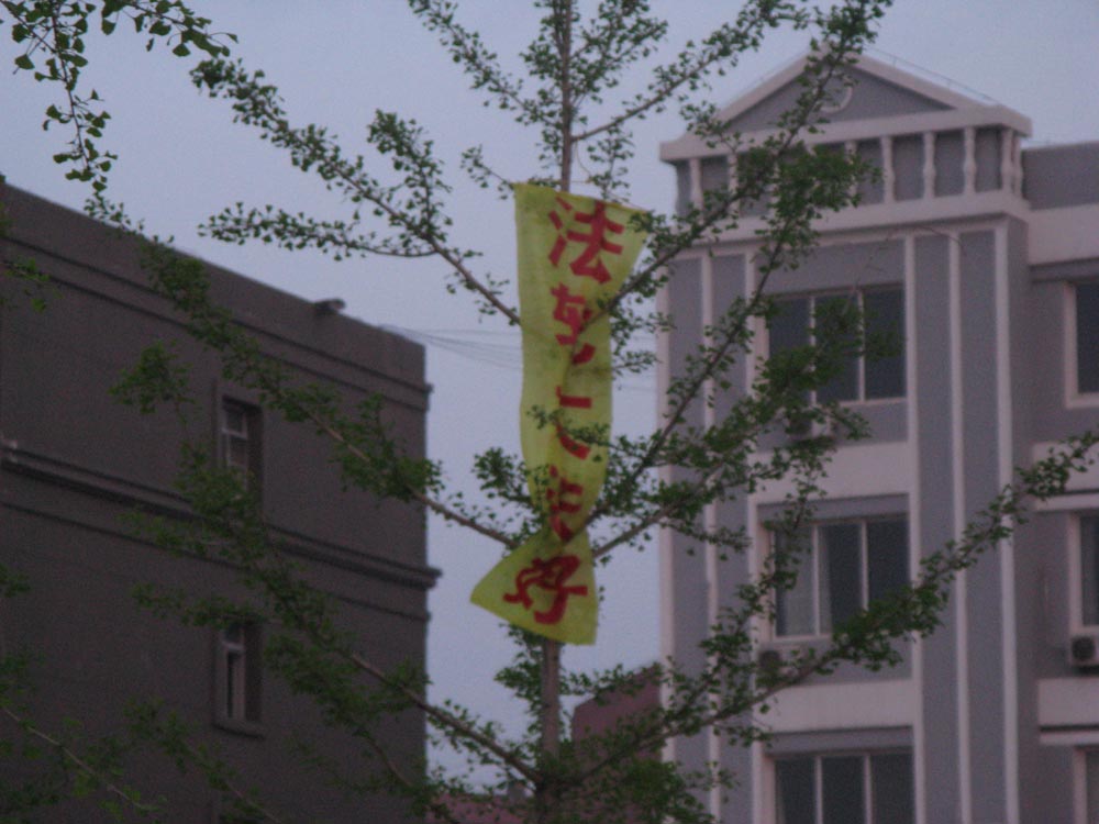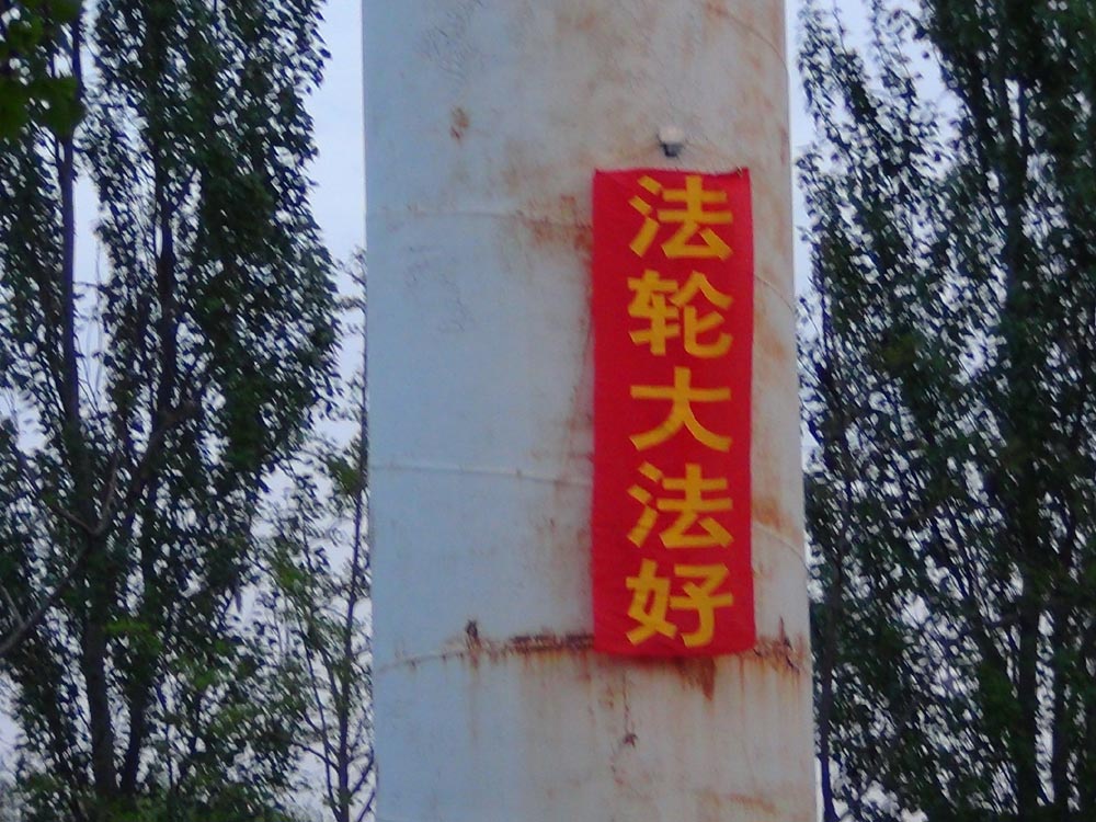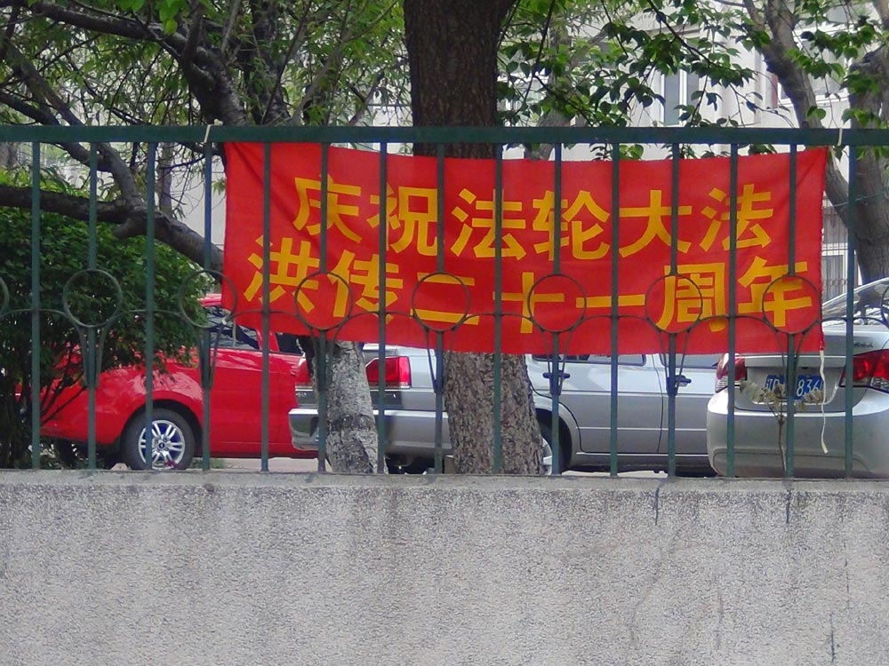 这一天,东北某地大法弟子,精心制作了几十条“法轮大法好”、“世界需要真善忍”、“立即停止迫害法轮功”等条幅。有的高高的飘扬在刚刚吐绿的柳树上,有的悬挂在高高的电杆上,有的挂在广告牌架上,红黄绿相互掩映,在阳光下迎风舞动,极其耀眼夺目,市内大街小巷到处可见,引无数行人驻足观看。