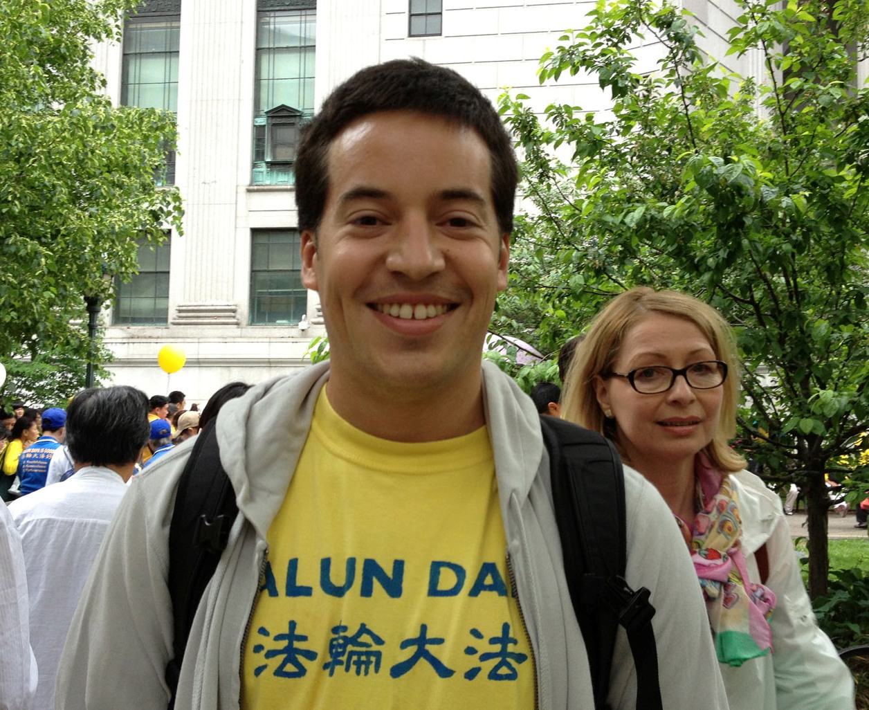 古巴法轮功学员约苏斯(Jesus)是一位一年前刚开始修炼的新学员,那时他正在寻找一种能够回归自然、远离现代摩登社会的方法。当接触到了法轮功之后,他感觉找到了新生。他开始跟当地的学法小组一起学法。他觉得来参加纽约的大游行真是选择对了,因为他平时很少有机会接触到其他法轮功学员,看到这么多同修,让他感到大家是一个整体和凝聚的力量,并感受到强大的能量场。