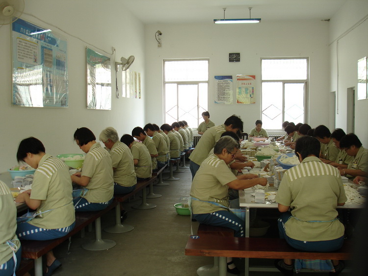 一旦走入习艺车间,高额定产就使人就如同上了弹簧的机器人,机械的以最快速度拼命干活,不能有任何多余动作,否则就完成高额定产。中午经常在堆满各种奴工产品,灰尘和有毒胶水气味中,在很短时间内吃完简单粗糙的饭食,马上就得继续干活。如果正吃饭时,送货车一到,也必须在狱警的监视下,放下碗筷马上就去卸车。