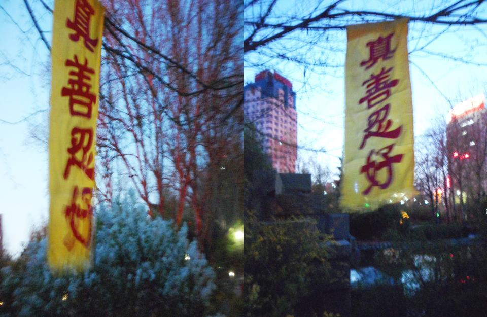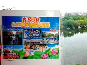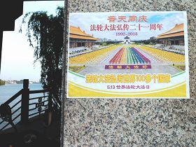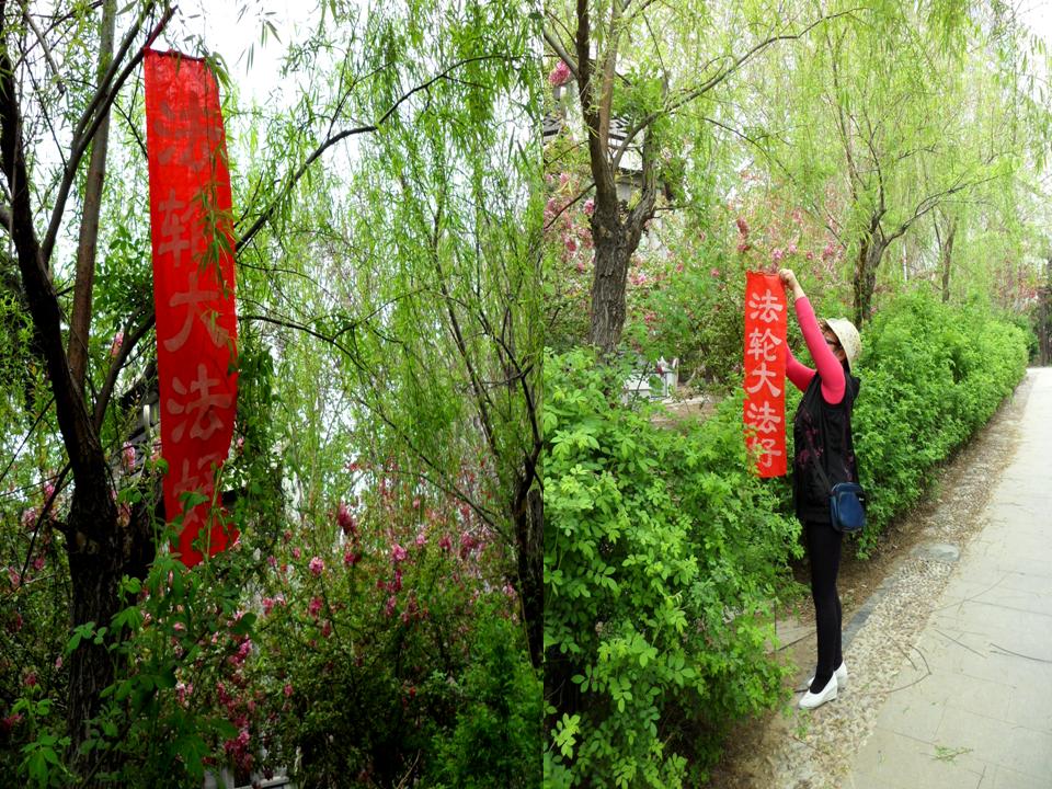 一位参加潍坊国际风筝会的游人(大法弟子),在 “五一三”法轮大法洪传世界二十一周年、普天同庆的日子里,拍摄到这景点上的法轮大法真相贴和“法轮大法好、真善忍好”条幅——可谓;万物众生沐福泽、花香飘逸莲乘云,绚丽夺目、法光照人。虽然传递来迟,可金色的五月永远永恒。