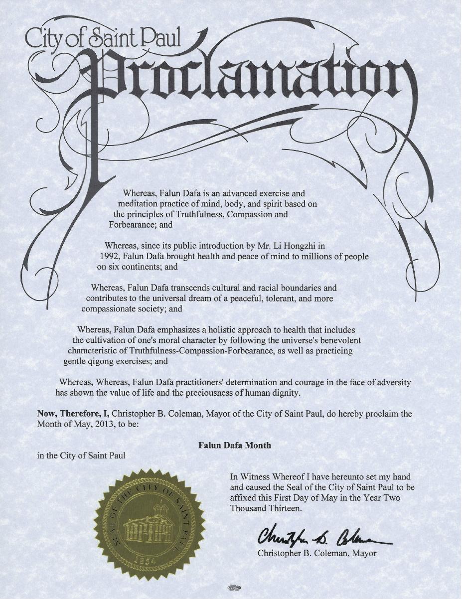 因此,现在,我,克里斯托夫·毕·克曼(Christopher B. Coleman),圣保罗市的市长,特此宣布二零一三年五月为圣保罗市的法轮大法月。