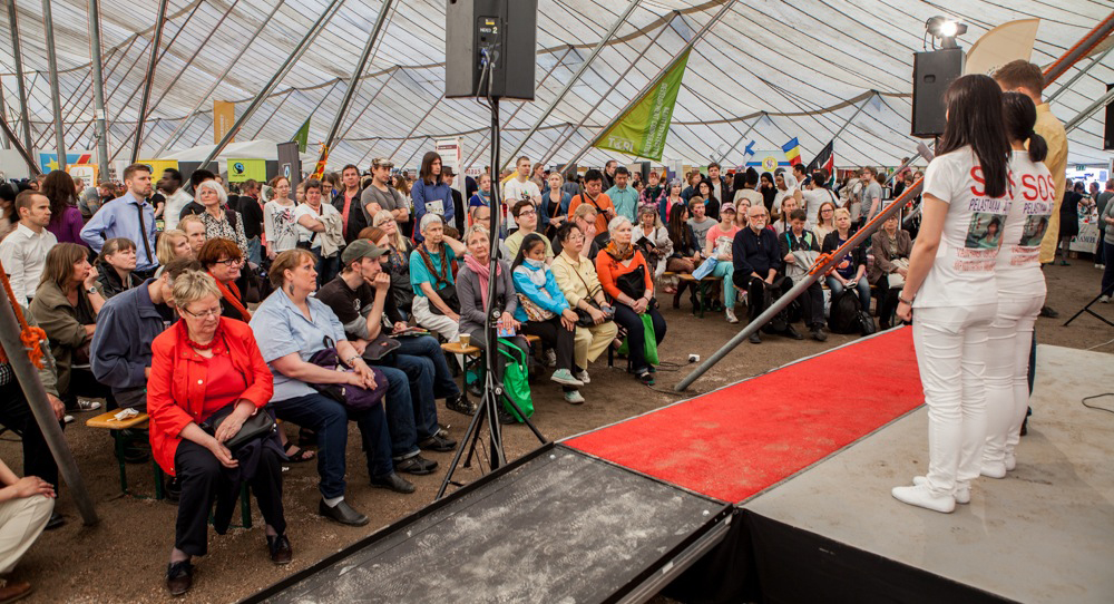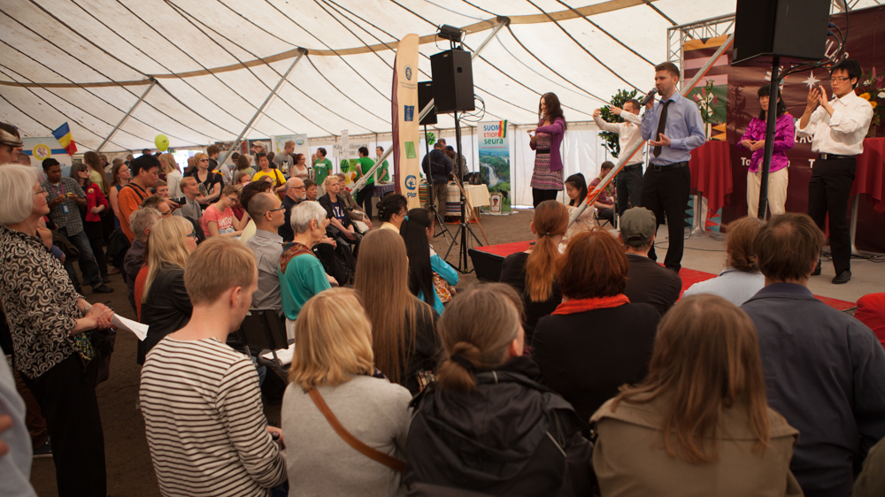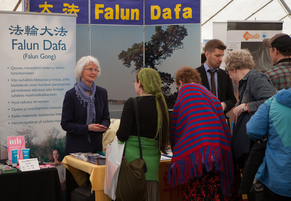 本次世界村活动安排了遭受中共非法迫害的法轮功学员讲真相。演讲台下,民众静静地聆听学员遭受中共非法监禁八年的案例。听到中共警察连续十四天每天二十四小时日夜轮番审讯逼供,使用电棍电击、长时间铐脚镣、不许睡觉等方式,企图瓦解法轮功学员的意志,使其放弃修炼的情况,人们为之动容。了解到芬兰政府对受迫害法轮功学员的营救,让一对坚修法轮功的学员能在因迫害而分离十一年后得以团聚,观众们激动地报以热烈的掌声。
