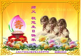 两个法轮功小弟子想对师父说:“祝师父生日快乐!法轮大法好!”