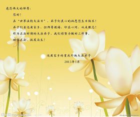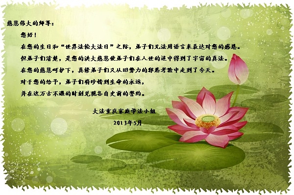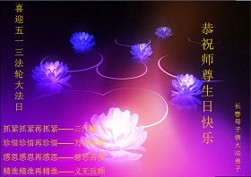 这是众生得救的大喜日子,也是弟子和师父团圆的日子,我们都希望师父能早日回到家乡来,弟子们都想念您呀,我们用精進迎接师父!和世界大法弟子圆容师父所要的。在师父的加持下做好三件事,跟师父回家。