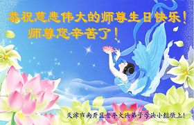 天津大法弟子恭贺师尊华诞暨法轮大法日(17条) 天津市南开区老年学法小组大法弟子恭祝慈悲伟大的师尊生日快乐!请师尊放心,弟子一定放下人心更加精進,做好三件事,消除间隔形成整体,助师正法,圆满随师还。