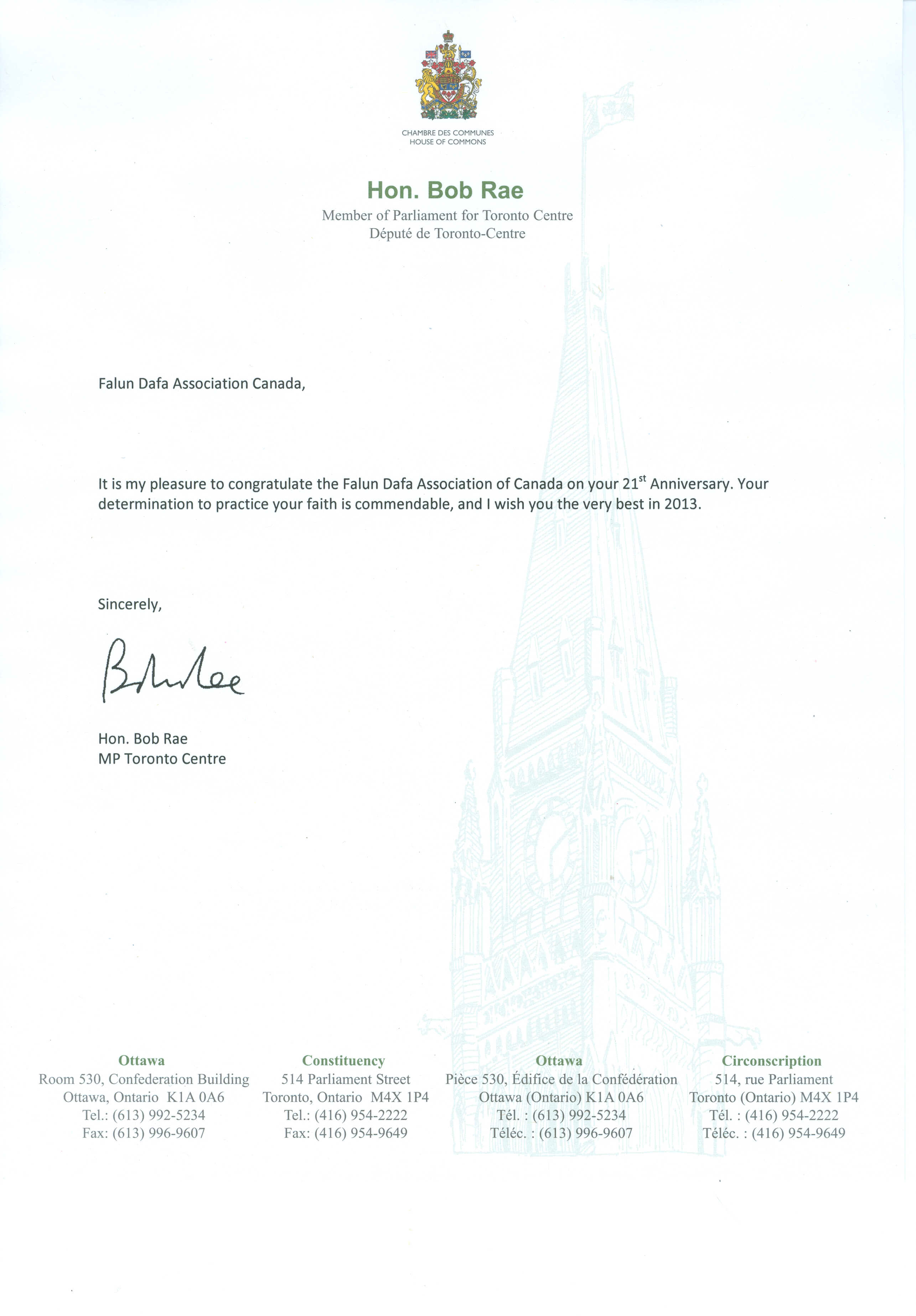 前安省省长, 自由党前党魁,多伦多市中心区联邦议员李博(Bob Rae)在贺信中说:“加拿大法轮大法协会,很荣幸在此祝贺法轮大法加拿大协会的21周年庆祝活动。你们对信仰的坚毅值得赞扬。衷心祝愿你们二零一三年美好,成功。”
