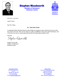 作为加拿大人我们很幸运生活在一个珍惜宗教自由,以及信仰的力量对社会发挥积极影响的国家。我们也很自豪我们的国家尊重来自世界各地的文化和传统。而法轮大法的理念和修炼是我们要引以自豪的传统。你们因为恪守真、善、忍原则而给我们做出了榜样。也激励我们用和平的方法解决争端。
