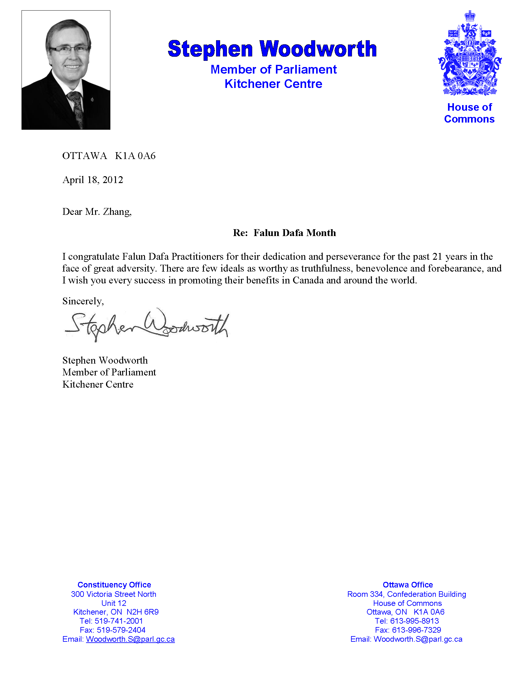 基奇纳中心选区联邦国会议员史蒂芬﹒武德沃斯(Stephen Woodworth)在贺信中说:“我祝贺法轮大法学员在过去二十一年的困境中,一直艰苦努力和不懈追求的走了过来。真善忍是这个世界上无与伦比的宝贵理念。我希望你们在加拿大和世界上每个角落对真善忍的推广都获得成功。”
