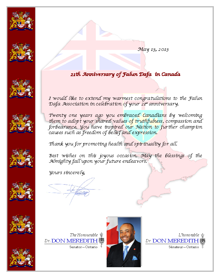 参议员贺信当﹒梅瑞迪斯博士(Dr. DON MEREDITH)在贺信中说:“致加拿大法轮大法传世二十一周年庆典。 在你们欢庆21周年庆典之际,我向法轮大法协会献上最热烈的祝贺。二十一年前,你们和加拿大民众分享了你们的真-善-忍理念。你们还激励了我们的国家进一步去声援捍卫信仰和言论自由的事业。