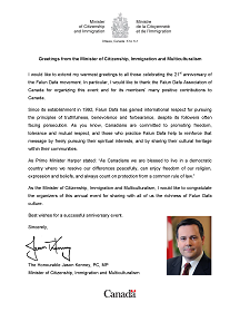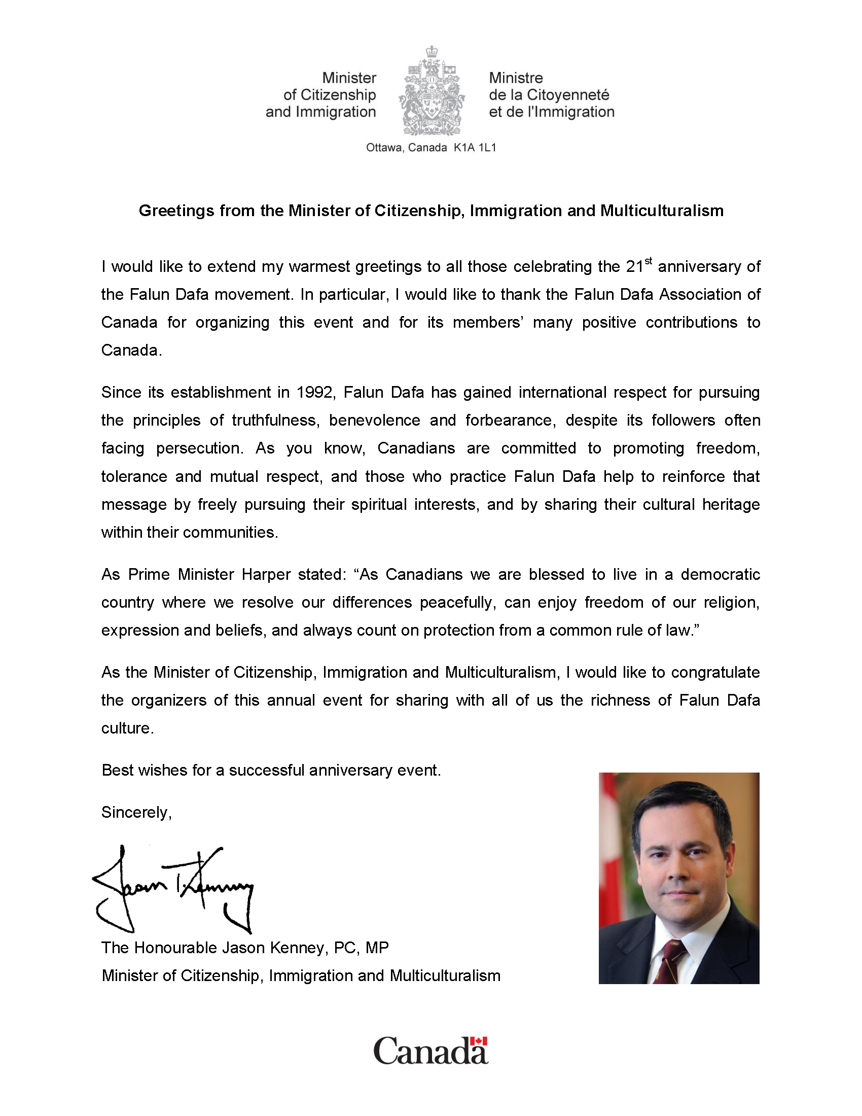 作为加拿大移民和多元文化部长,我祝贺活动的主办方组织这每年一次的庆典活动来和我们分享法轮大法的文化!祝活动圆满成功!