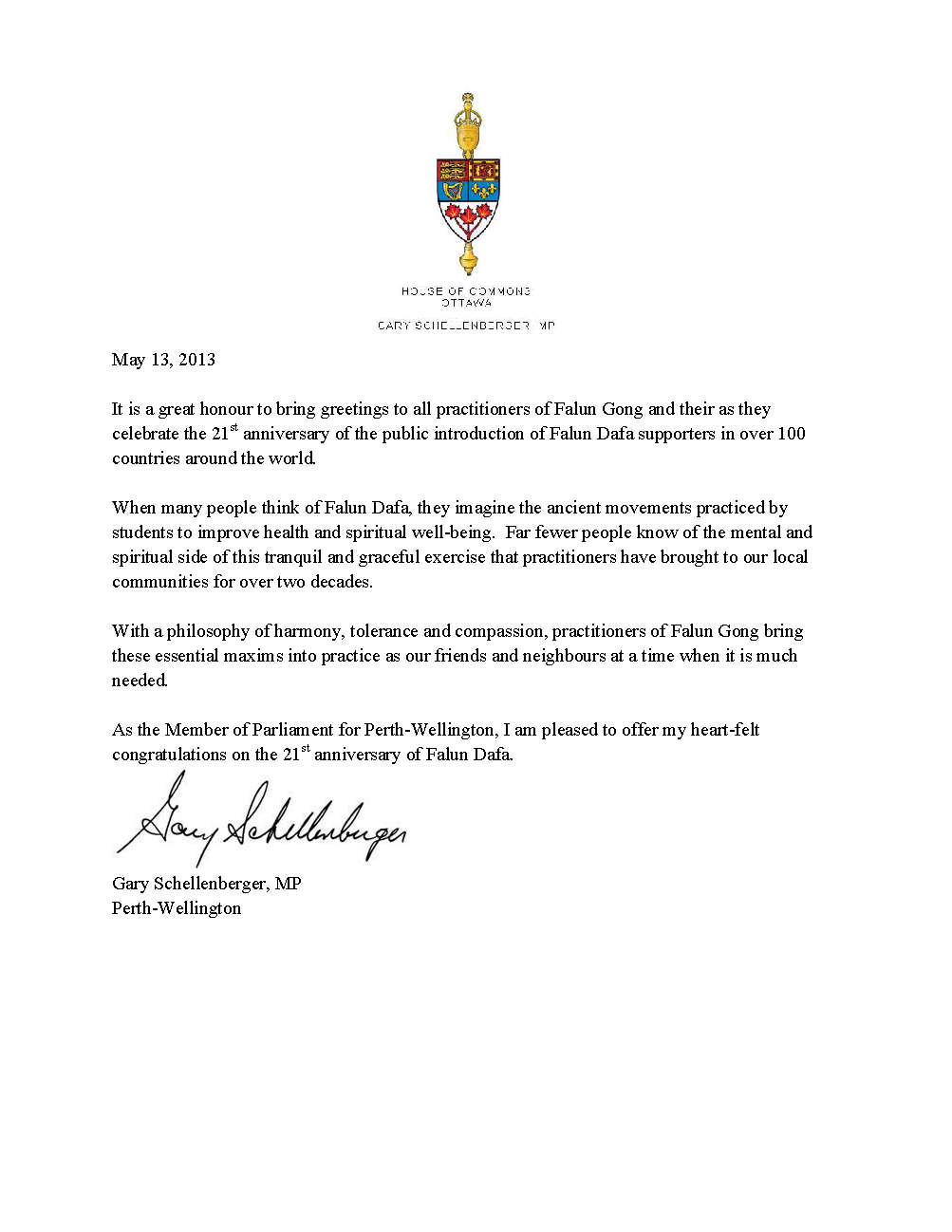 作为泊斯-惠灵顿Perth-Wellington区的国会议员,我很高兴在此表达我衷心的祝贺,祝贺法轮大法洪传二十一周年!