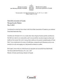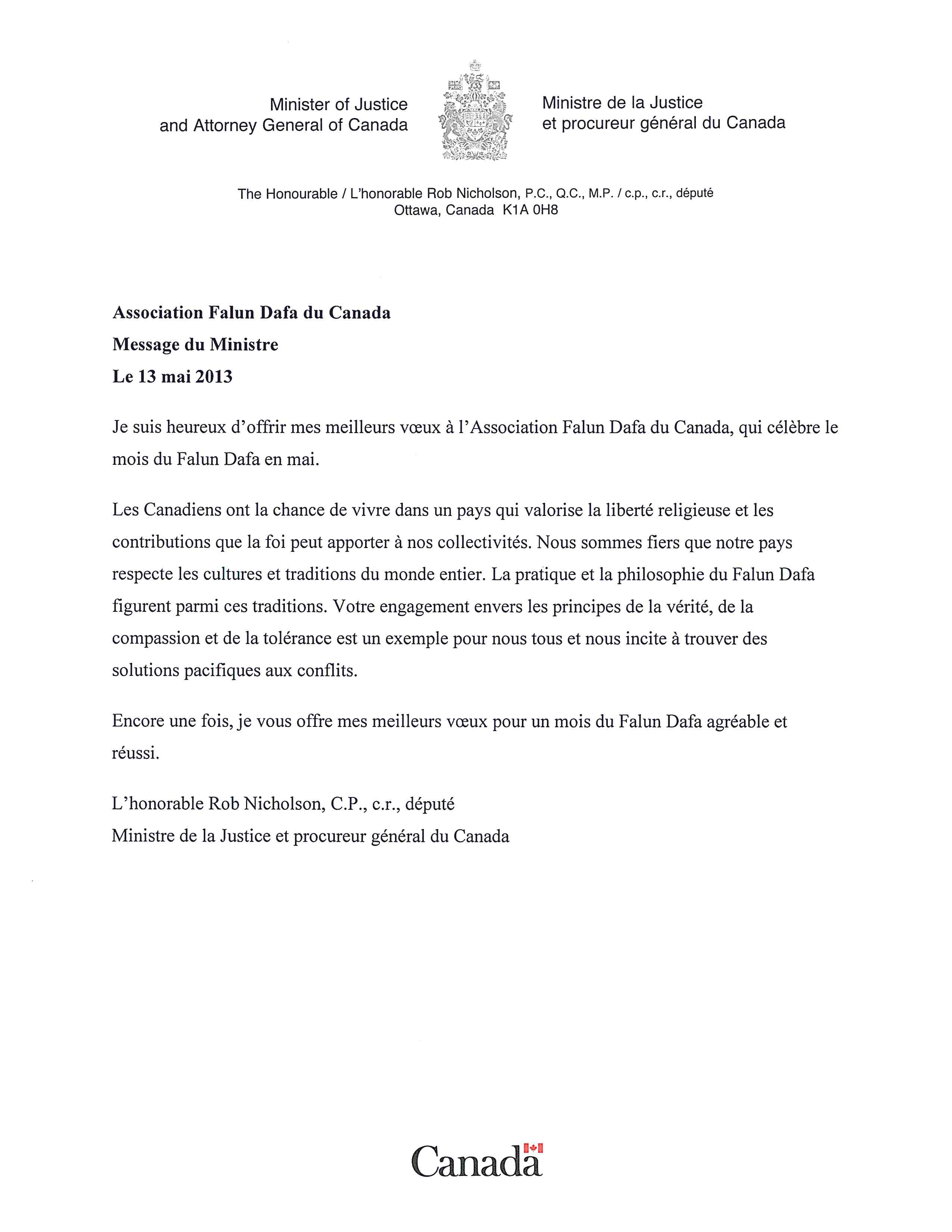 加拿大司法部长,检察总长罗布﹒尼科爾森(Rob Nicholson)的贺信: