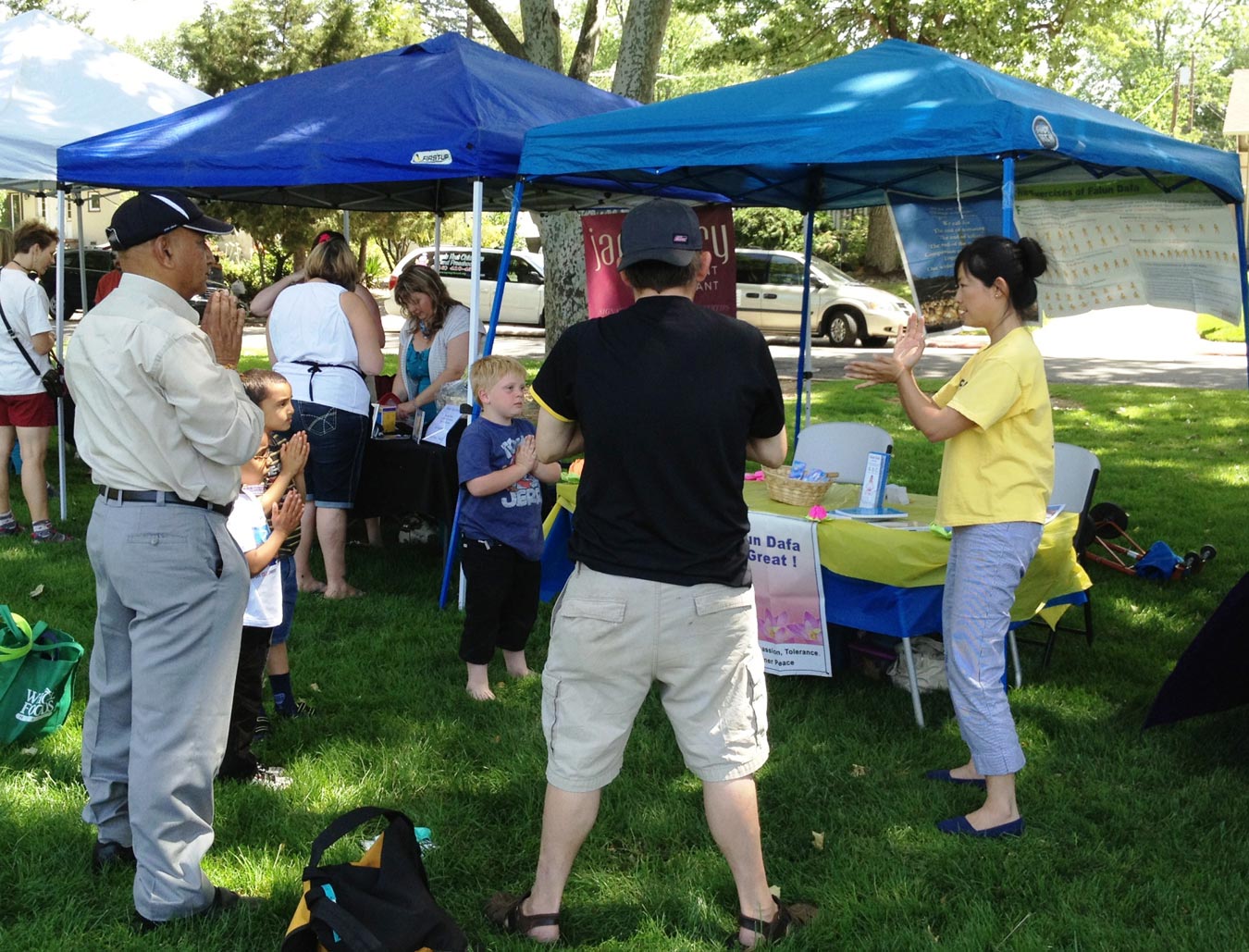许多民众热心了解法轮功,一些老人、家长和孩子们兴致勃勃地学完了法轮功的五套功法。带有法轮大法信息的小莲花广受欢迎,也吸引孩子们前来学习如何制作小莲花。人们互相告知:去看看那个美丽的(法轮功)展台。