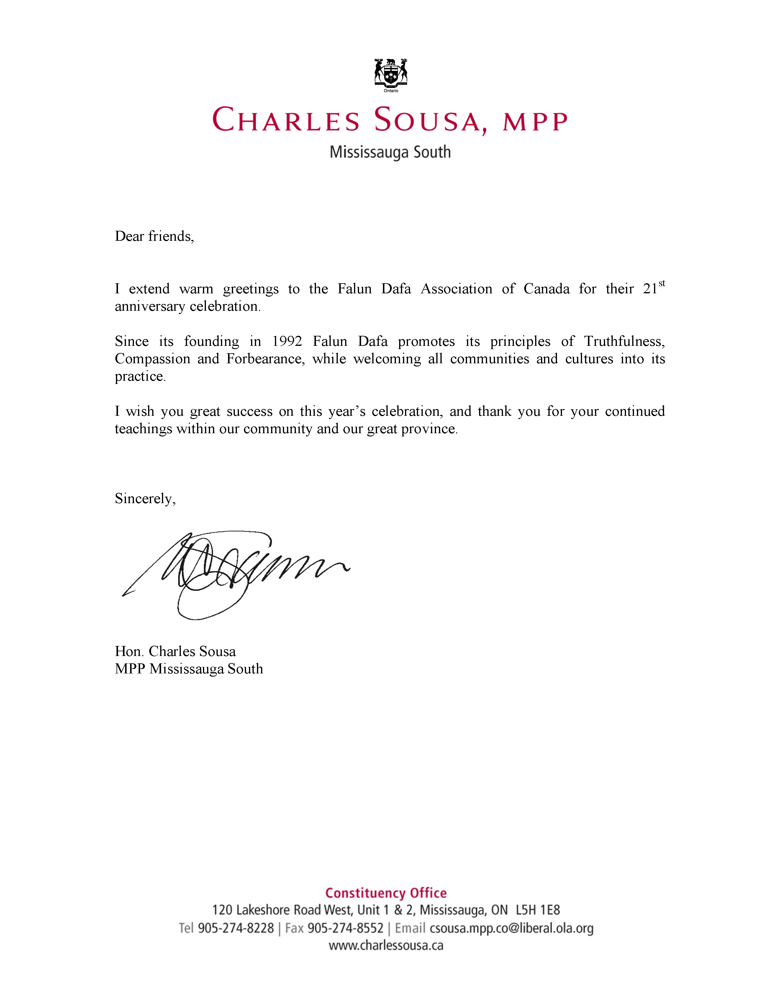 米西沙家南区省议院,安省财政厅长苏善民(Charles Sousa)在贺信中说:“亲爱的朋友,在加拿大法轮大法协会庆祝法轮大法二十一周年之际,我衷心的祝福你们。