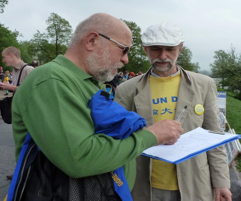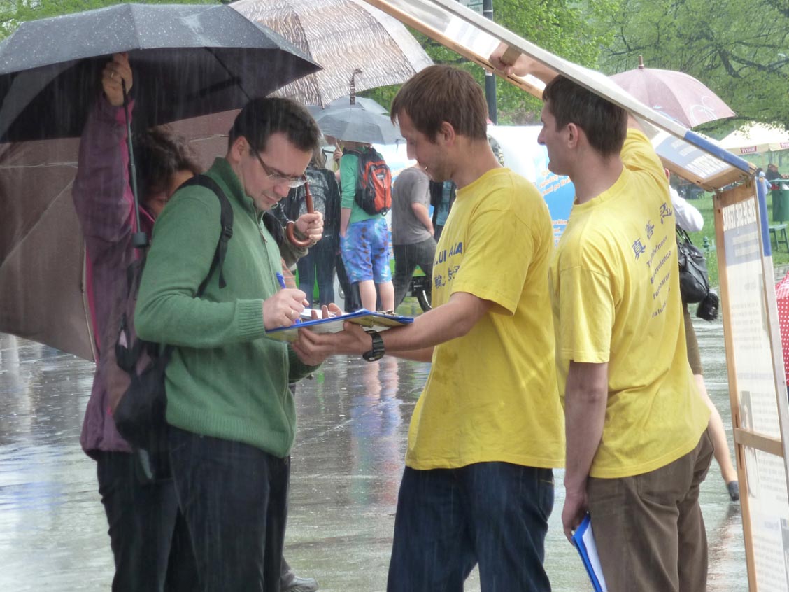 来自德国的一位先生说:“我在德国就知道法轮功了,我也看过真相资料,这事太惨了,我在德国已签过名,今天我再签一次名,我希望尽快结束这个悲剧,这种事必须立即停止,立即停止!”