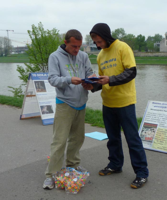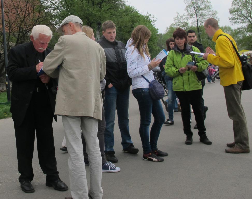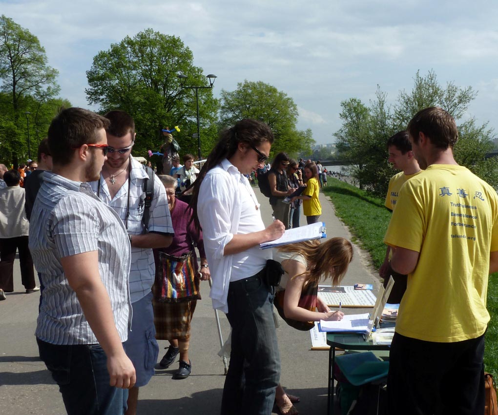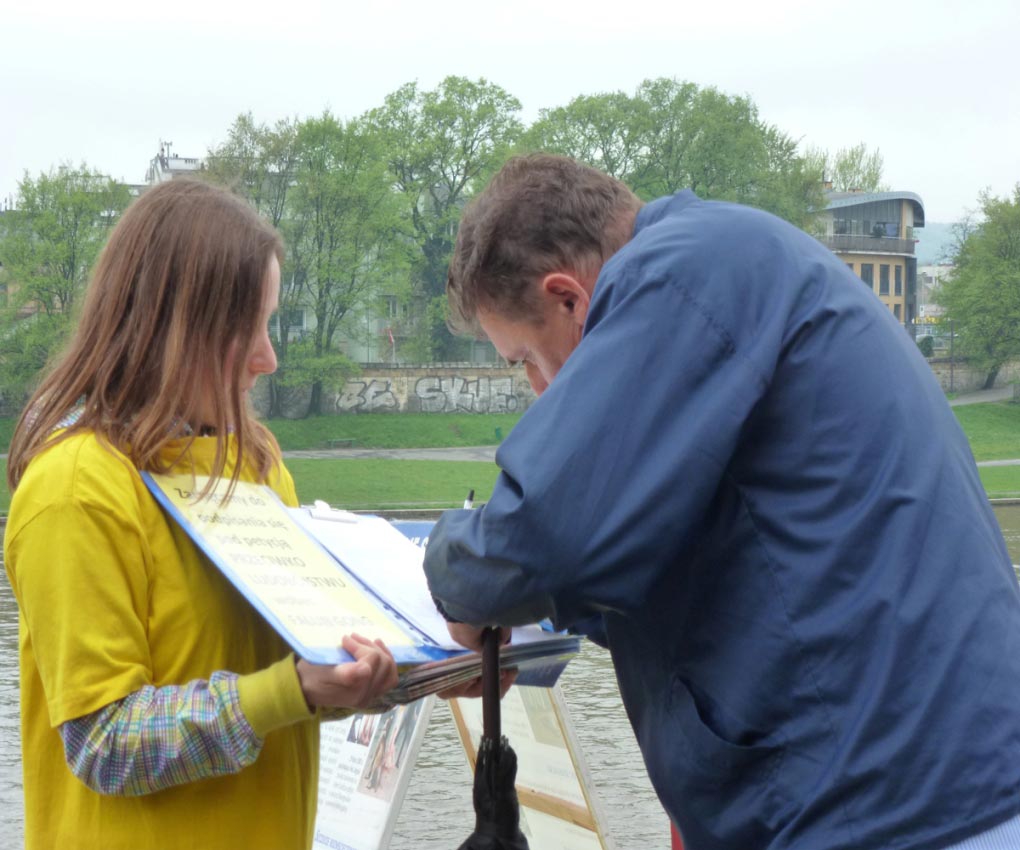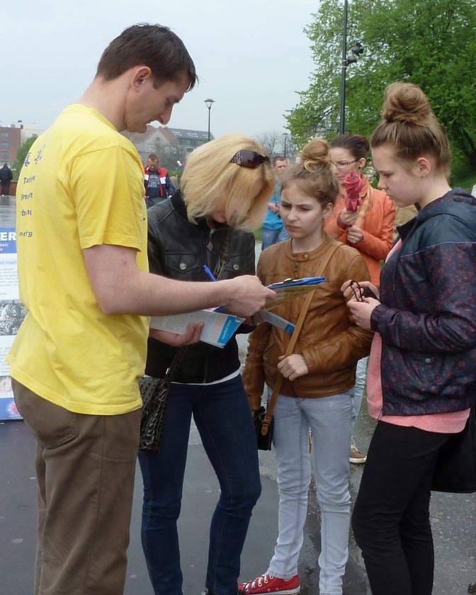 来自俄罗斯的一位先生说:“我在这里签名,不仅表达我反对这种迫害,也是表达我对法轮功的尊敬和敬佩,你们做得好,坚持住啊!”
