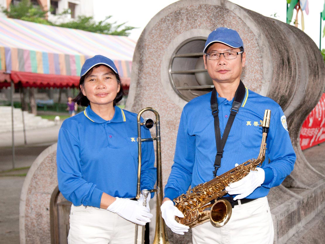 垦丁恒春幼儿园园长白玉美,先生陈胜利是国小主任退休,他们从二零零三年得法,今天一起来参加法轮大法日庆祝师父生日的活动,几乎每年都来参加这样的活动。夫妇一起参加天国乐团,白玉美吹长号,陈胜利吹萨克斯风,他们和孩子全家五个人都是天国乐团的团员,最想告诉世人修炼法轮大法的美好。