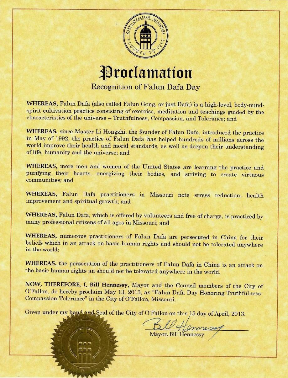 鉴此,市长及市议会代表奥法隆市,特此宣告二零一三年五月十三日为奥法隆市“颂扬真、善、忍的法轮大法日”。