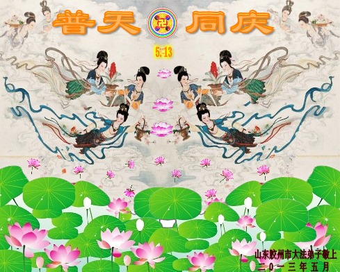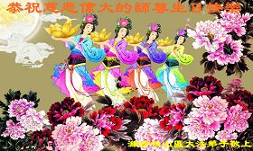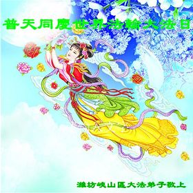 ![]() 美丽的仙女队手捧大莲花降凡献瑞,带给民众大法美好。 |