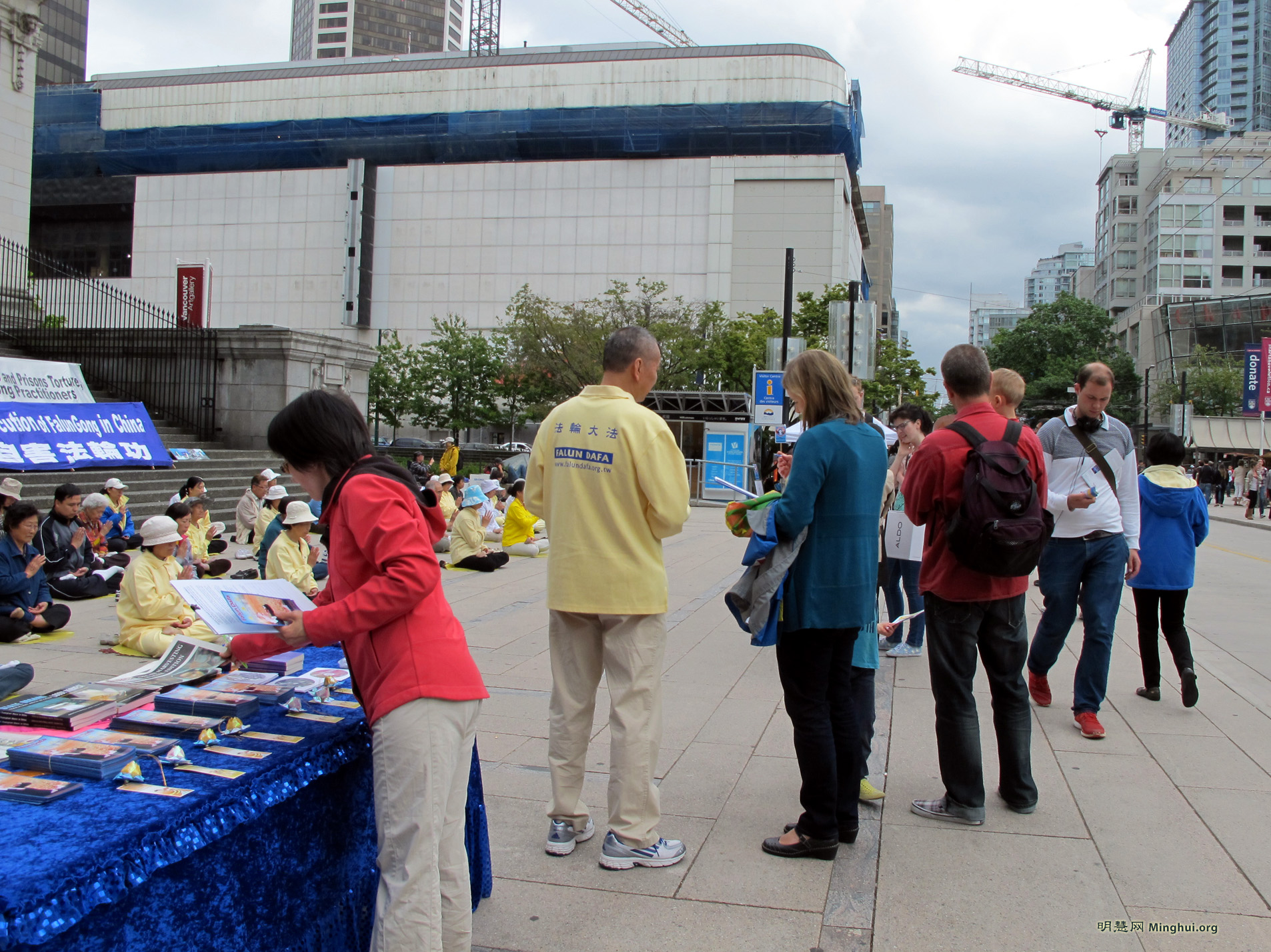 温哥华法轮功学员在集会期间穿插着炼功、讲真相和向世人征集签名,许多行人在了解真相后,纷纷在呼吁停止迫害法轮功、追查活摘器官的提案上签名。一位来自亚洲在学院读书的学生Alisha Faza 听了真相后表示非常吃惊,她说自己是第一次听到这样可怕的事情,她表示回去要写文章,让更多的人知道。