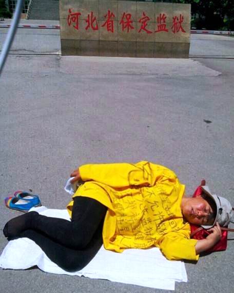 ![]() 5月29日上午被石志勇当众侮辱心脏病复发,躺在烈日下不能动弹的孙素云 | ![]() 5月29日下午,孙素云遭受欺辱后依然站在保定监狱门前身穿冤衣为救丈夫呼吁 |