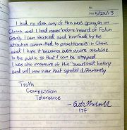 (在此之前)我一点也不知道在中国发生了什么,也从未听说过法轮功。我震惊于中国大陆的法轮功学员所承受的暴行是如此的可怕,我希望有更多的公众知道这场迫害,从而能够制止迫害。以前我也不知道卍字符的历史和意义,现在我知道了。真,善,忍。——Butz Melnick