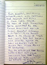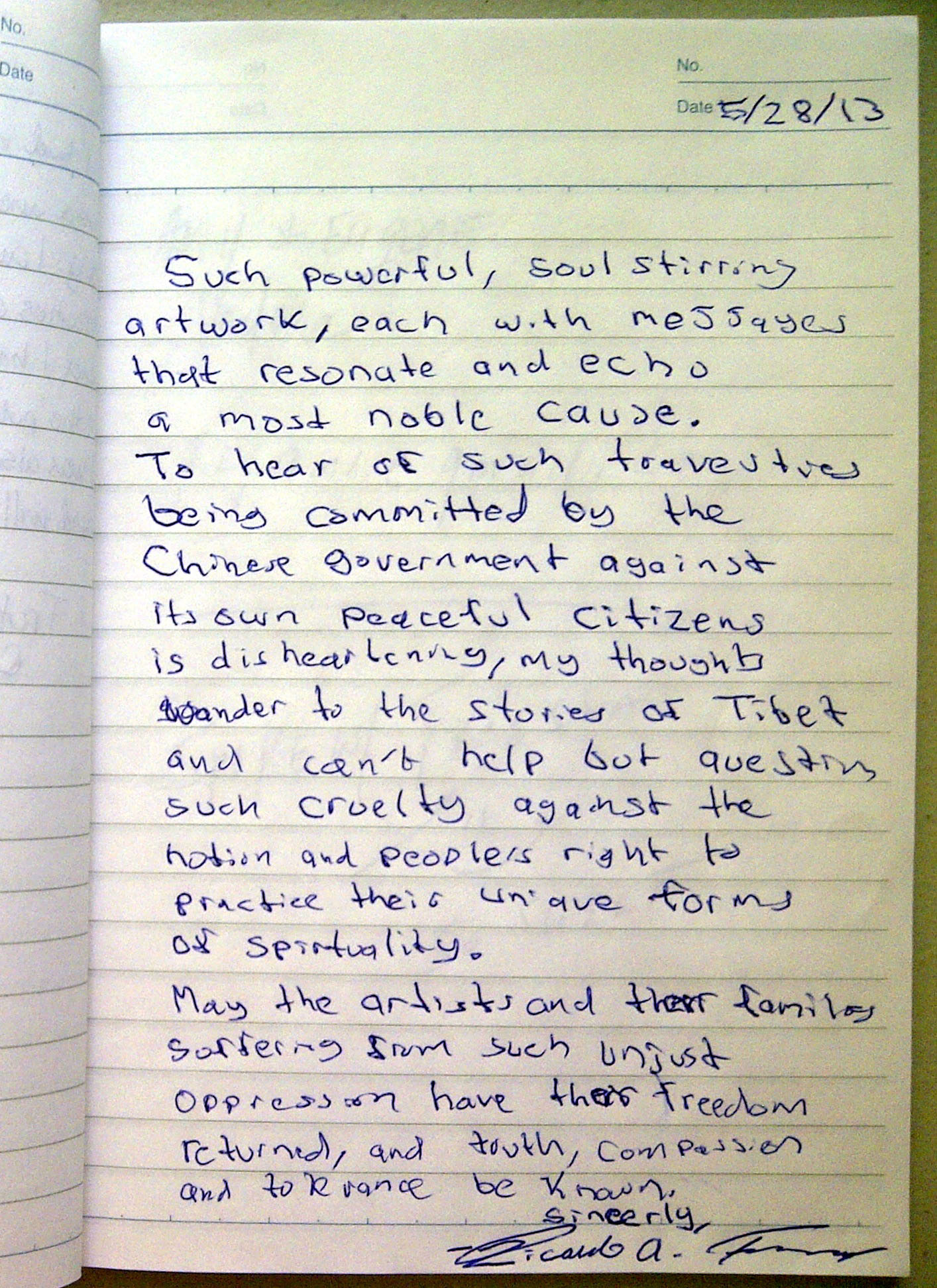 这些如此有力度的、触及心灵的画作,每一幅都传递着引人共鸣的信息和对崇高信念(信仰法轮功)的回应。这样一个被无数和平的中国民众所接受、令人喜爱的功法却正在被中共当局迫害,让我感到非常沮丧,这也让我想起了中共当局对西藏民众的迫害,这是怎样一个残暴的政府。我衷心希望画作的艺术家们以及所有被迫害的法轮功学员能够早日重获自由,也希望“真善忍”能够让更多人所知道。——Richard A.F。