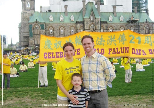 ![]() 二零一三年五月八日,加拿大首都渥太华国会山前,德鲁与妻子及儿子在法轮大法传世二十一周年庆祝活动现场 |