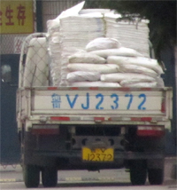 运输原材料的卡车,车号是“鲁VJ2372”,车上拉着成摞的叠好的空袋子和盛满原材料的像化肥袋的白袋子。卡车把原材料拉进昌乐劳教所监区,供被关押者(包括法轮功学员)加工成产品,销往全国各地甚至国外。