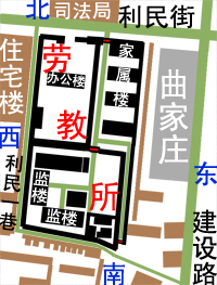 山东省潍坊市昌乐劳教所,分为警察办公的大院和关押人的监区大院,办公的大院大门口挂的牌子是“山东省潍坊市劳教管理所”和“潍坊市城郊地区检察院检察室”二块牌子。关押人的监区大院外大门没挂牌子,内大门(即:关押劳教人员的地方)挂的牌子是“劳教管理区”。