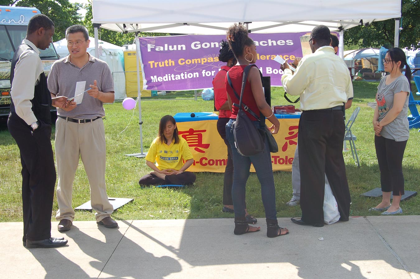 Jay是一位黑人妇女,路过展位时,听着法轮功学员的介绍很感兴趣。她天目是开的,但往往会看到一些吓人的景象。法轮功学员告诉她《转法轮》中对天目有详细的介绍,并说修炼法轮功层次提高非常快,层次提高后,天目就会看到美妙的景象。Jay兴奋地说:“这就是我要找的。”她马上询问密市的炼功点在哪里,并说回去立即阅读《转法轮》。