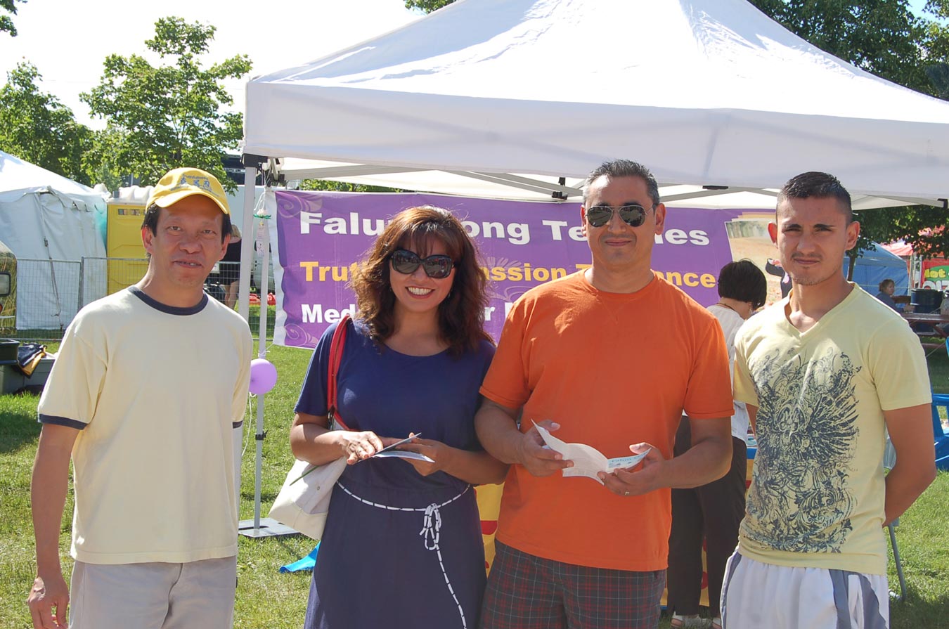 展位上学员都在忙着给路过展位有兴趣的人介绍法轮大法,法轮功学员Frannie 说:“一次刚介绍完上一个,转头看见还有一西人女士和一西人男士微笑地看着我,他们正等着听介绍。我先给女士介绍,她很感兴趣耐心地听着;我还告诉她,不幸的是,这么神圣的功法在中国大陆被当权者中共迫害。同时我告诉她为什么法轮功会在中共的统治下被迫害,是因为当权者宣扬无神论,不相信神佛,摧毁中国五千年的神传文化,打击善良。在谈到此时,我顺便提及了现在风靡世界的神韵艺术表演,是以恢复中国五千年神传正统文化为宗旨的,巡回世界几十个国家,成为‘世界第一秀’。”