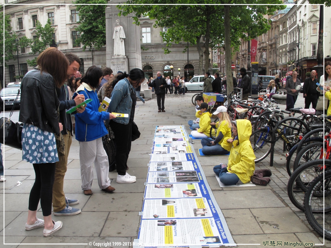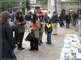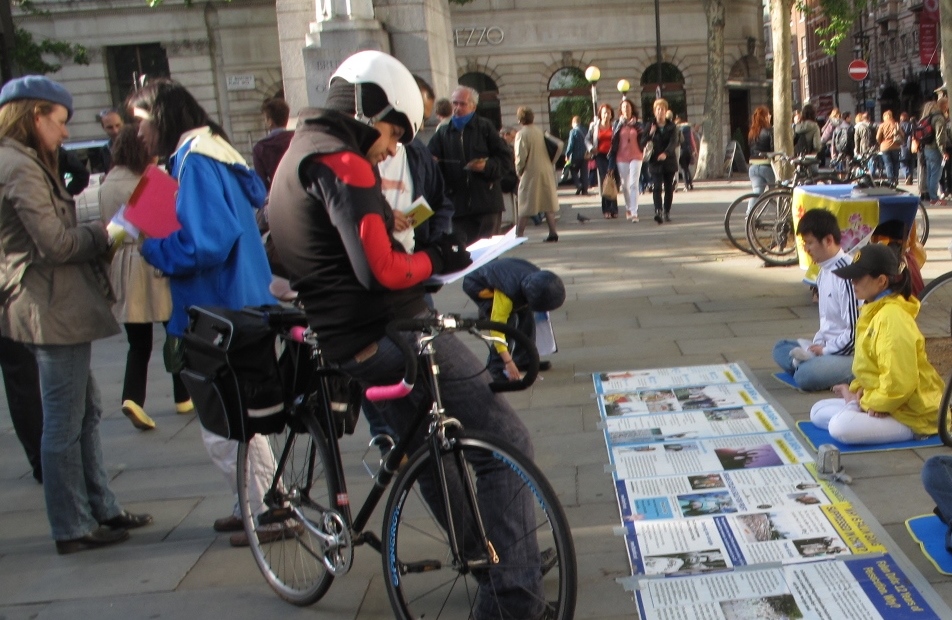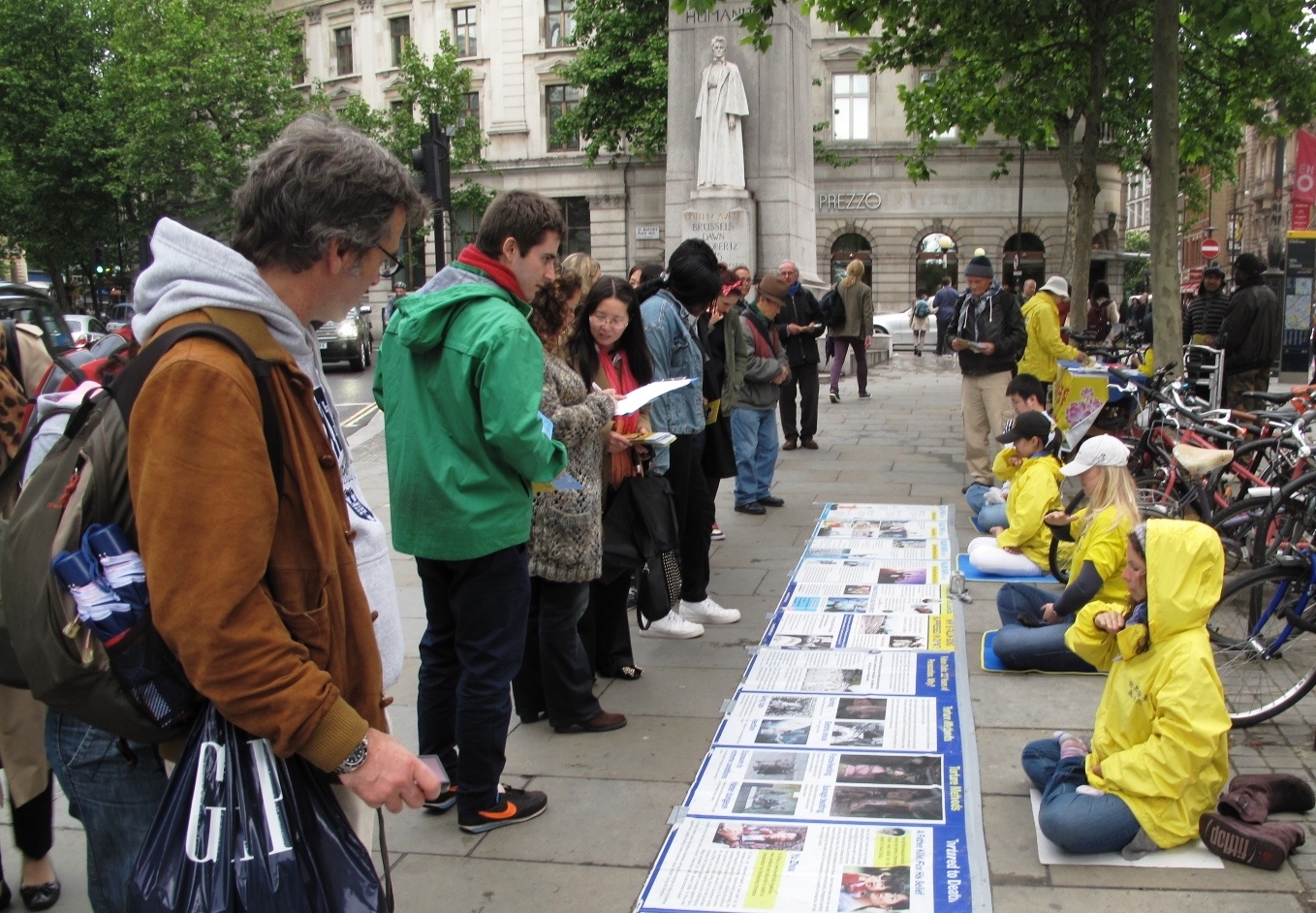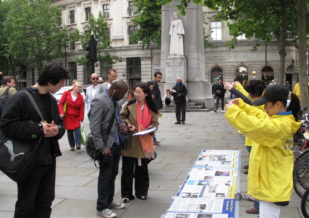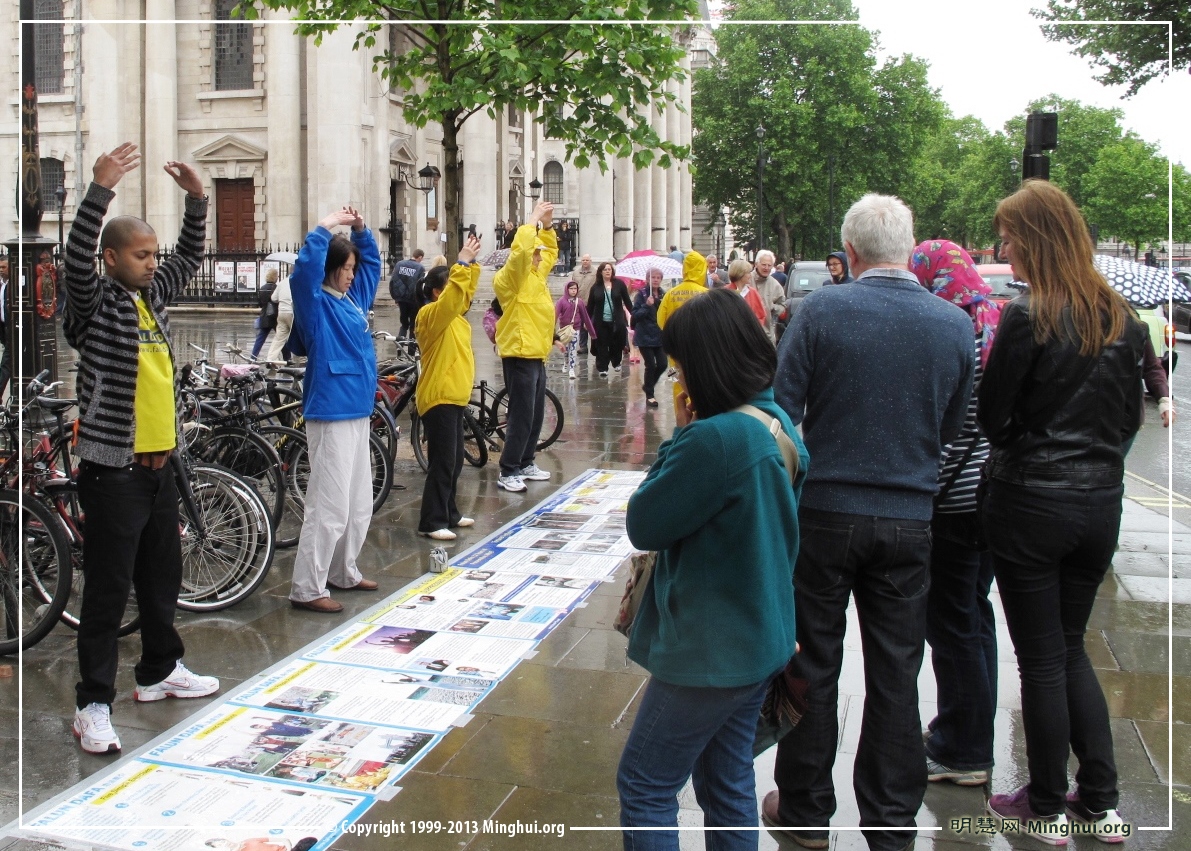 当天伦敦的天气时晴时雨,而法轮功学员不受天气影响,在七个小时里不间断地演炼功法、派发传单、讲真相和反迫害征签。