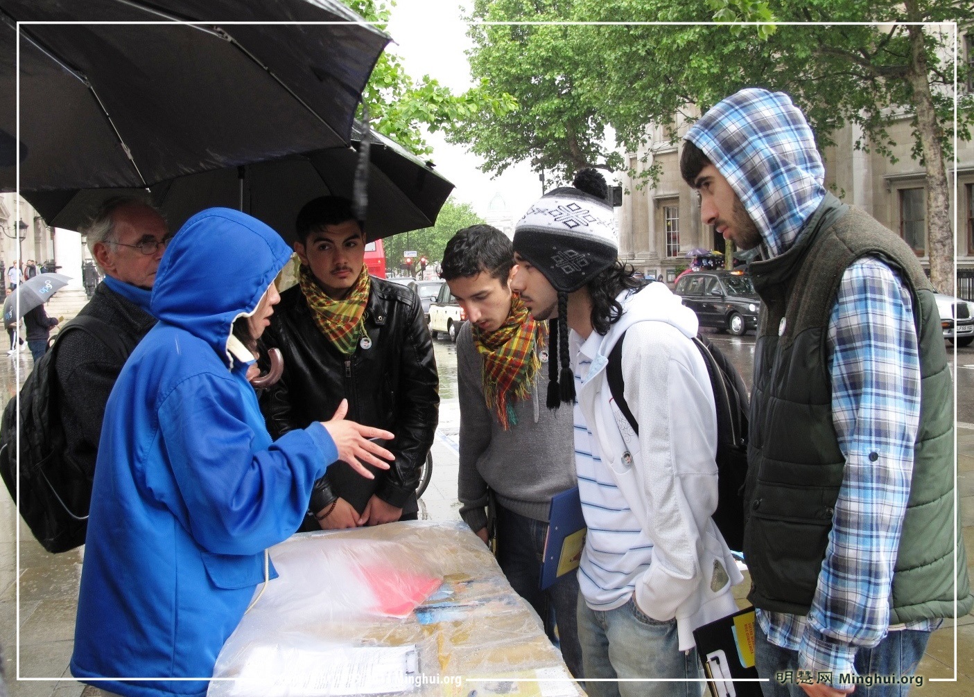 法轮功学员一如既往持之以恒的努力,让越来越多的英国民众和国际游客看到法轮功、了解法轮功真相;而法轮功学员在突降风雨中的淡定坚持,得以让很多有缘经过的路人瞬间感悟法轮大法带给修炼人的超常力量。下午时分伦敦的一场大雨,促成了四位土耳其青年了解法轮功真相、支持法轮功反迫害的独特机缘。