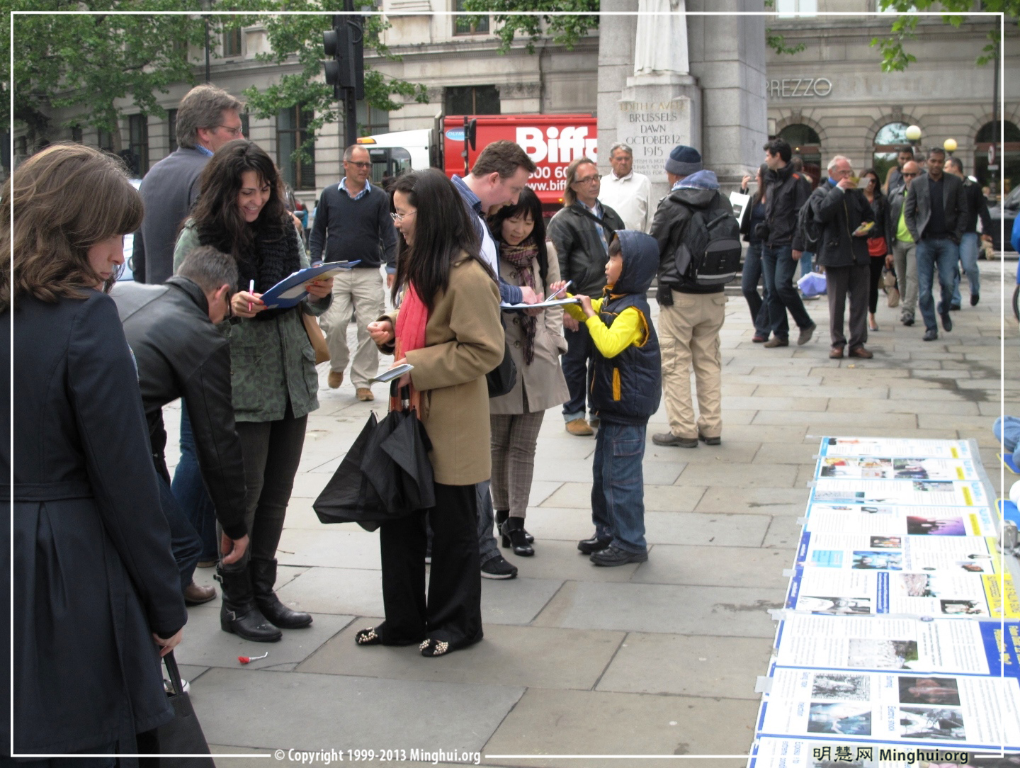 一阵突然而来的大雨很快过去,阳光出来了,法轮功学员在阳光下继续着炼功、发传单、讲真相和反迫害征签,圣马丁广场刚被雨水洗刷的地面在顷刻间变干,法轮功学员身上刚才曾在大雨中被打湿的黄色外套在阳光下放着柔和的光芒。街上的行人从四面八方向圣马丁广场涌来,很多人驻足观看正在炼第五套功法的法轮功学员,有时甚至形成两、三层的人墙,他们当中很多人先是被法轮功学员祥和入静的面容所吸引,接着就把专注的目光投向地上揭露中共迫害法轮功真相的展板。接着,他们会接到法轮功学员递来的传单,然后,他们纷纷在反迫害征签表上签字。他们说的最多一句话就是“(活摘器官)这样的事必须停止。希望事情改变。”