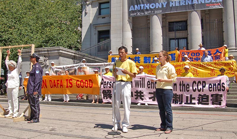 ![]() 图1:二零零九年七月十九日,在温哥华法轮功反迫害十周年集会上,张忠余呼吁国际社会制止中共对法轮功学员灭绝人性的迫害 |