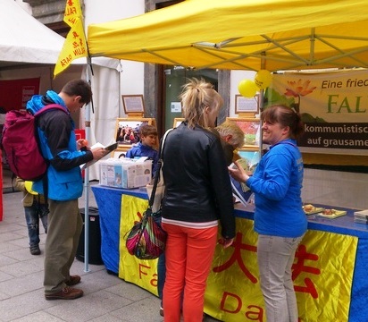 一对夫妻来到信息台前,无须学员们过多讲解即留下签名,先生说:“我在多伦多时认识了法轮功,我在那儿住过很长一段时间。”他不知道在自己的家乡也有法轮功学员,他的妻子很感兴趣,马上想要学习法轮功的功法。