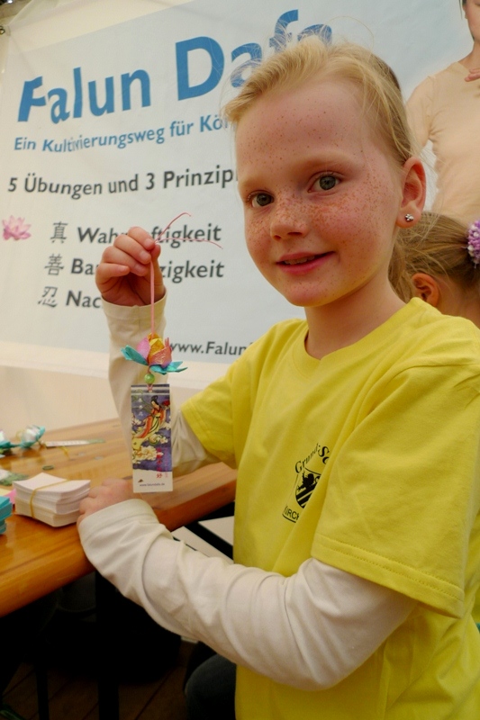 活动中,法轮功学员同时展示五套功法,孩子们和家长都好奇的看着,非常想更多的了解。一位学员给他们讲解,这五套功法可以使身体轻松健康,功法还会帮助人更好的集中精神,放松心情。当有的孩子询问莲花有什么与众不同之处时,一位学员解释道:“莲花出淤泥而不染。在中国文化里,莲花象征美好和坚毅,就象法轮大法修炼者。”