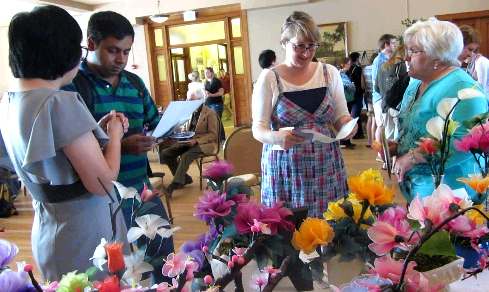 ![]() 图:人们在美丽的丝花前驻足认真的看着法轮大法简介 |