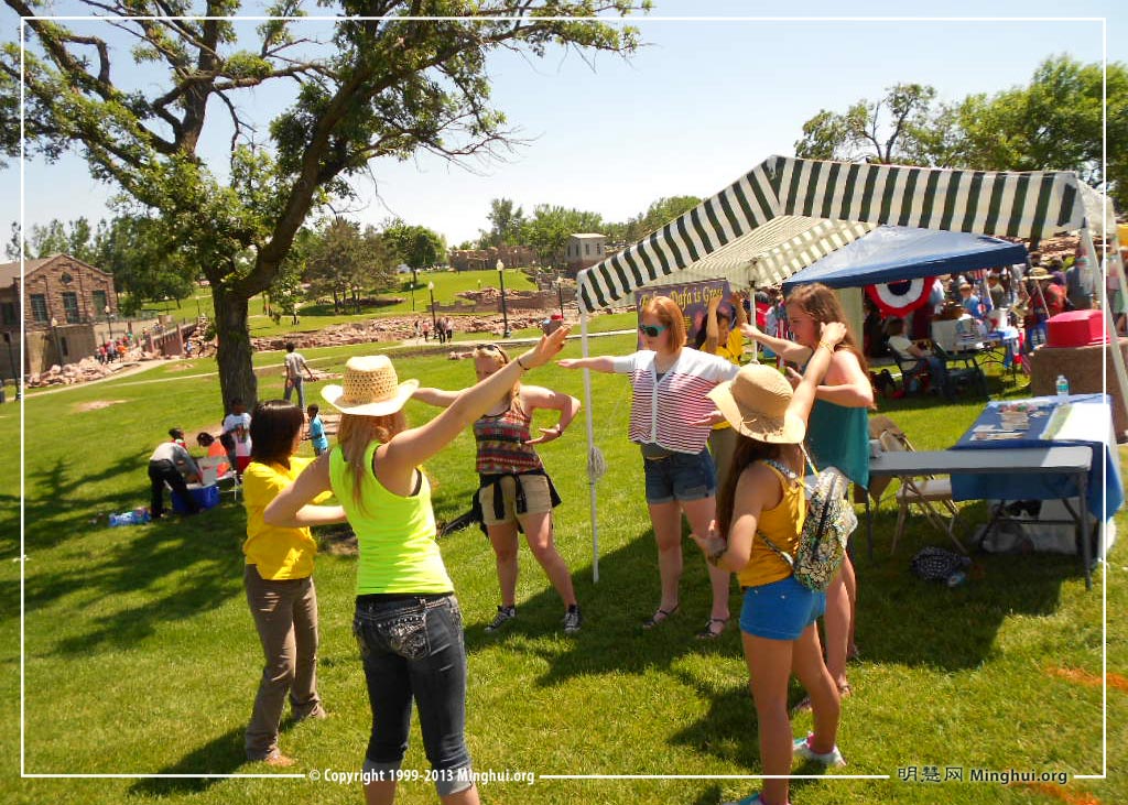 ![]() 游客在美国南达科他州苏福儿市多元文化节上学炼法轮功功法 |