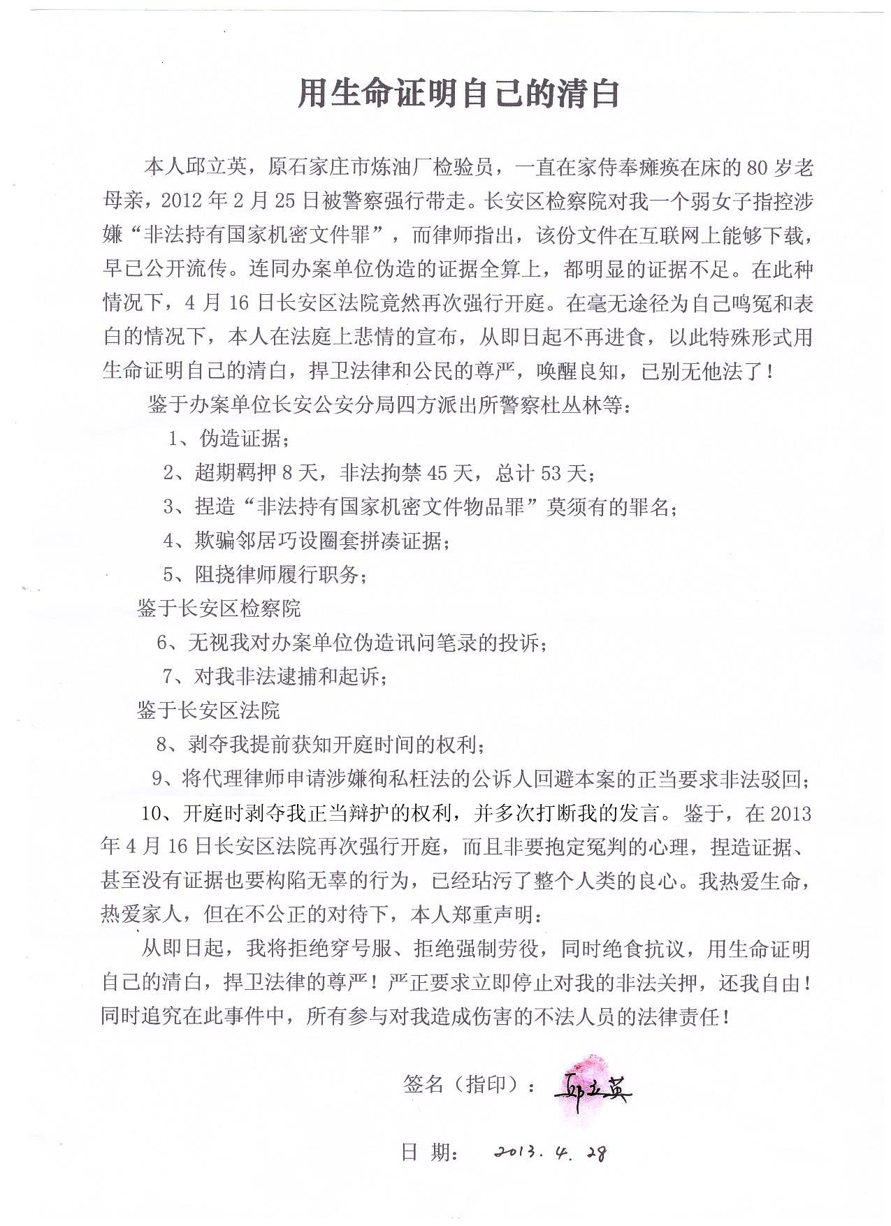 ![]() 图7:遭诬审之后邱立英绝食抗议石家庄市长安区公检法执法犯罪的声明 |