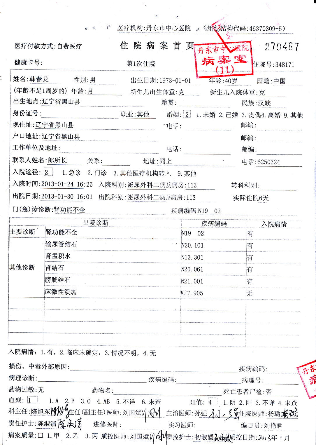 一月二十四日,韩春龙右侧腰腹部出现疼痛,并逐渐加重,一天无尿,体温达38.5度,最后被辗转送到丹东市中心医院(二院)救治。在医院病志记录上写着:“B超示右肾结石,右肾积水伴输尿管上端扩张,膀胱结石。进一步行CTU检查,提示右肾结石,右肾积水,右输尿管结石,左肾结石,左肾盂扩张,左输尿管结石,膀胱结石。”“初步诊断:1、肾功能不全。2输尿管结石(双侧)。3肾盂积水(双侧)。4肾结石(双侧)。5膀胱结石。”“确定诊断:1肾功能不全。2输尿管结石(双侧)。3肾盂积水(双侧,合并感染)。4肾结石(双侧)。5膀胱结石。补充诊断:应激性溃疡。在医院的另一个手术记录上写着“左侧输尿管口显示不清,右侧输尿管口成裂隙状。”