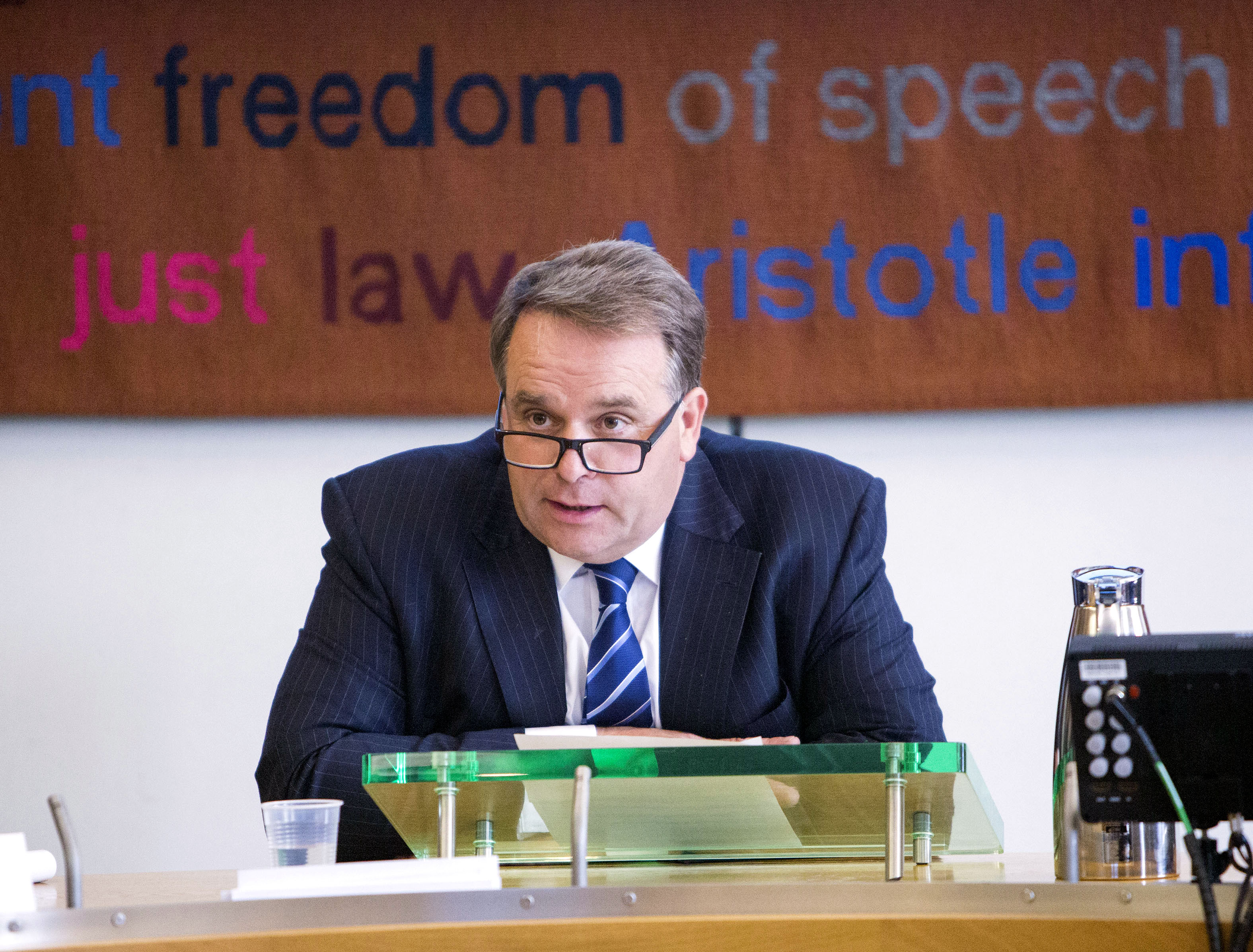 英国保守党政治家、国会议员尼尔•帕里士(Neil Parish)正在主持揭露“史无前例的邪恶”的研讨会。