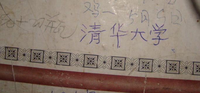![]() 柳志梅在自家破旧的瓦窑墙上,写下“清华大学”四个字。(摄于二零一零年冬) |